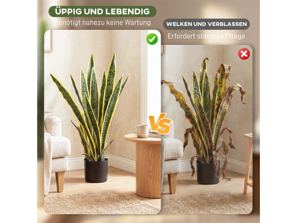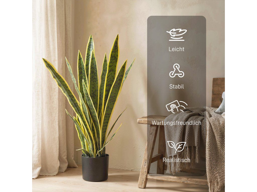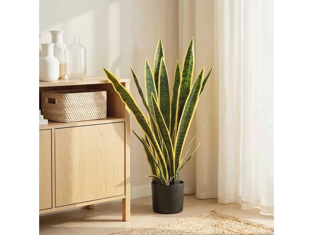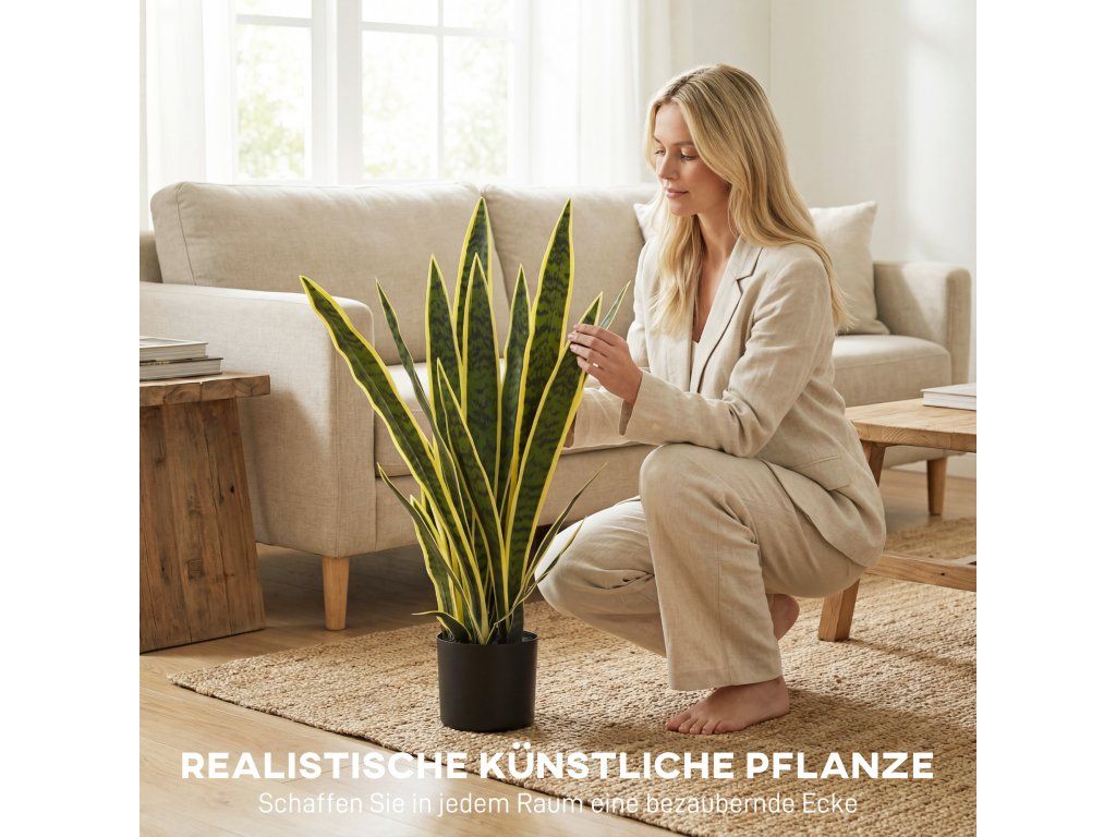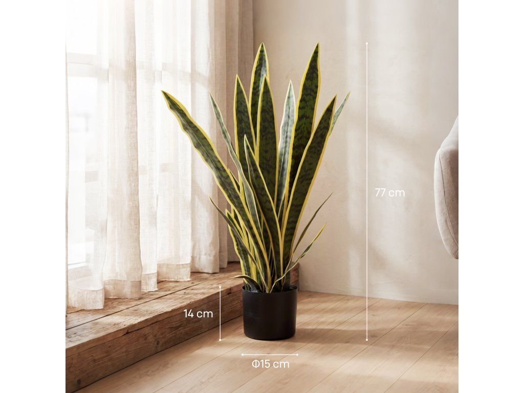 Vysoce realistický design: Tato umělá Sansevieria zaujme svými štíhlými, širokými listy, které mají realistickou texturu a zářivé barvy. Díky vysoce kvalitnímu zpracování vypadá klamně reálně, zatímco přirozený pocit z listů dále umocňuje její autentický vzhled.