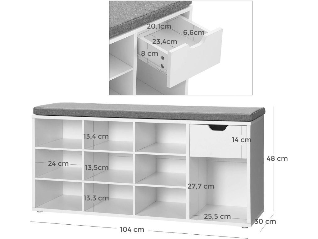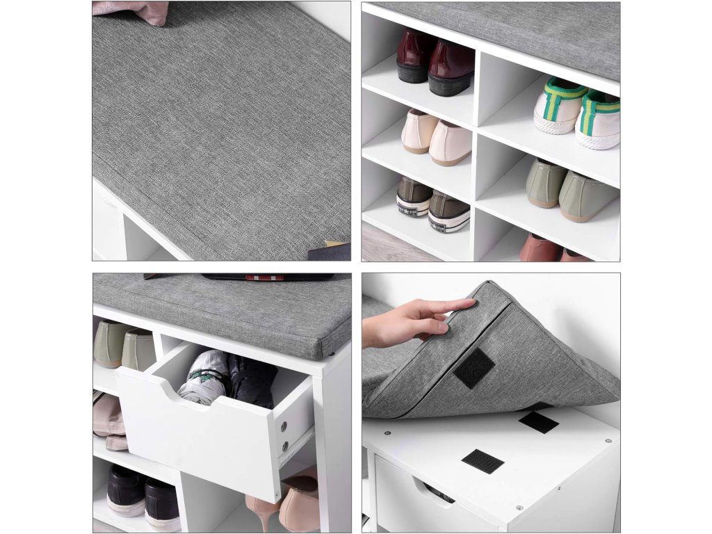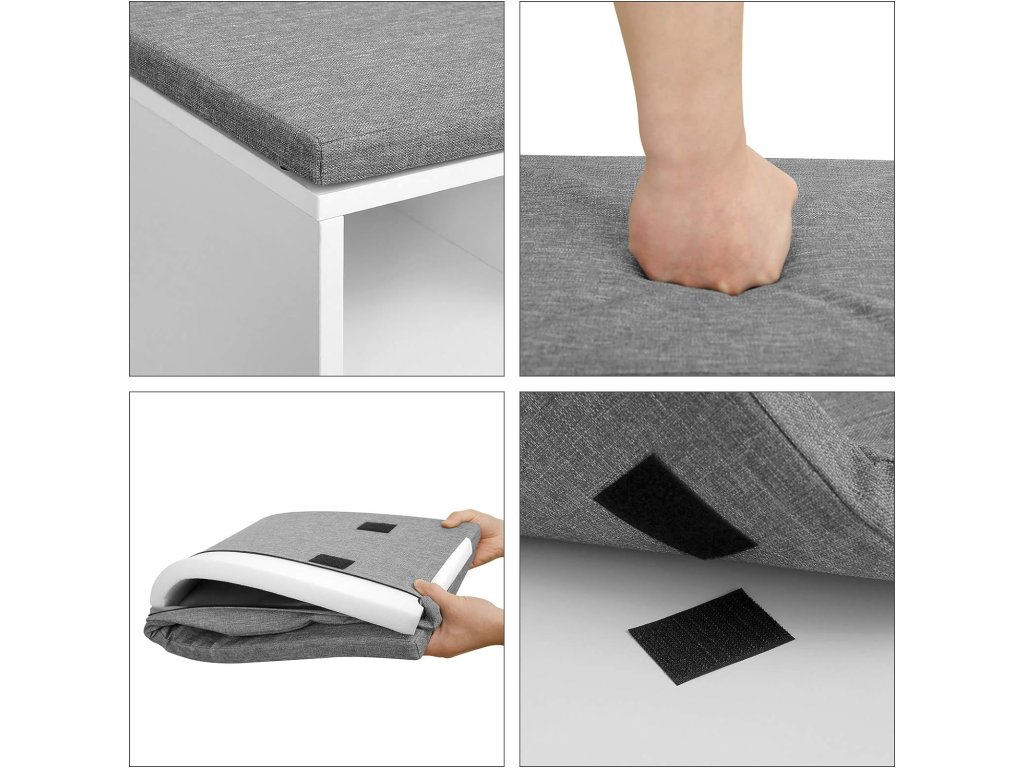 Lavice na boty, lavice se 2 otevřenými a 1 uzavřeným prostorem, police na boty, polstrovaný sedák, do předsíně, obývacího pokoje, ložnice, bílá a šedá.