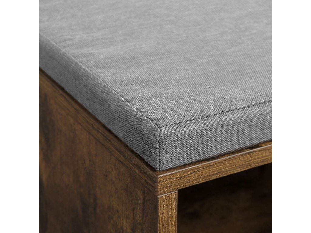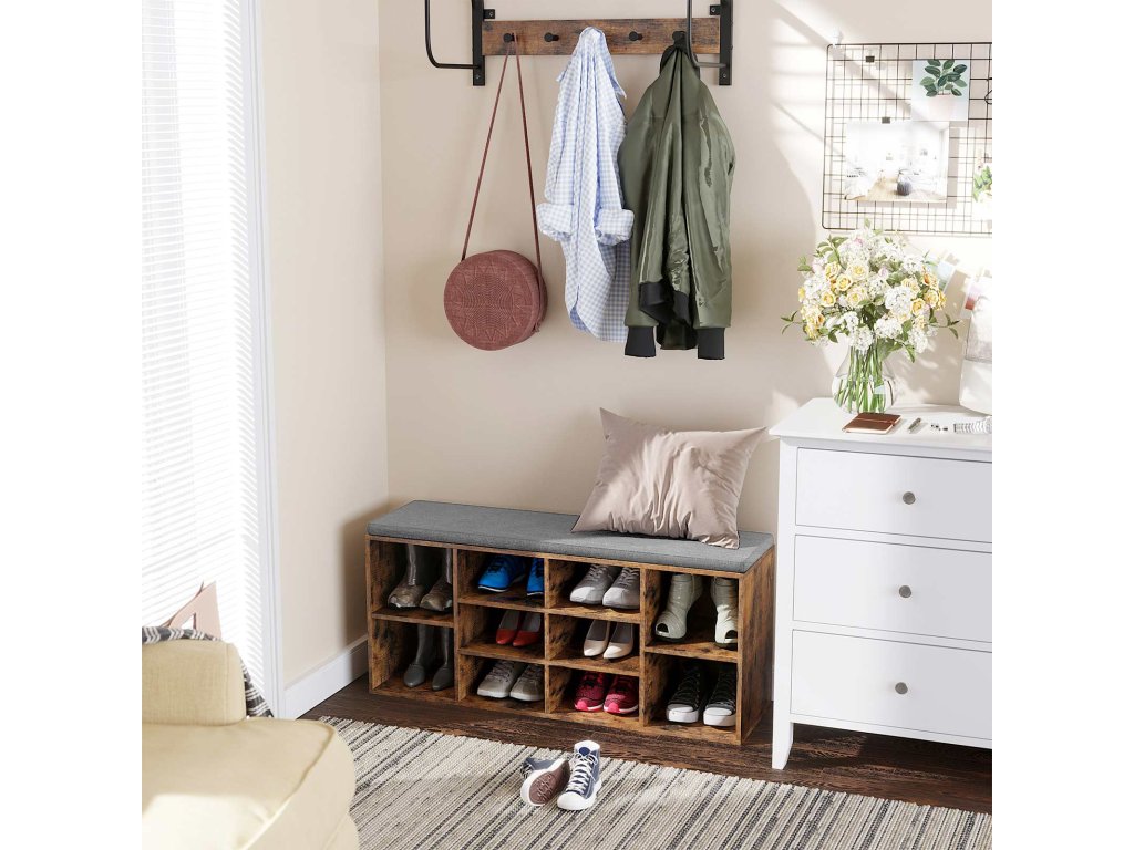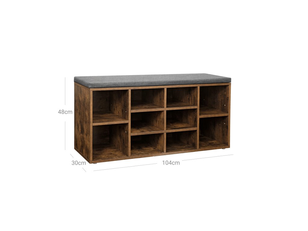 Lavice na boty, police na boty, skříňka, 10 přihrádek, s polštářem, do předsíně, 104 x 30 x 48 cm, barva dub.