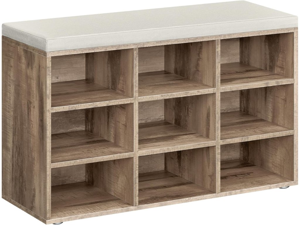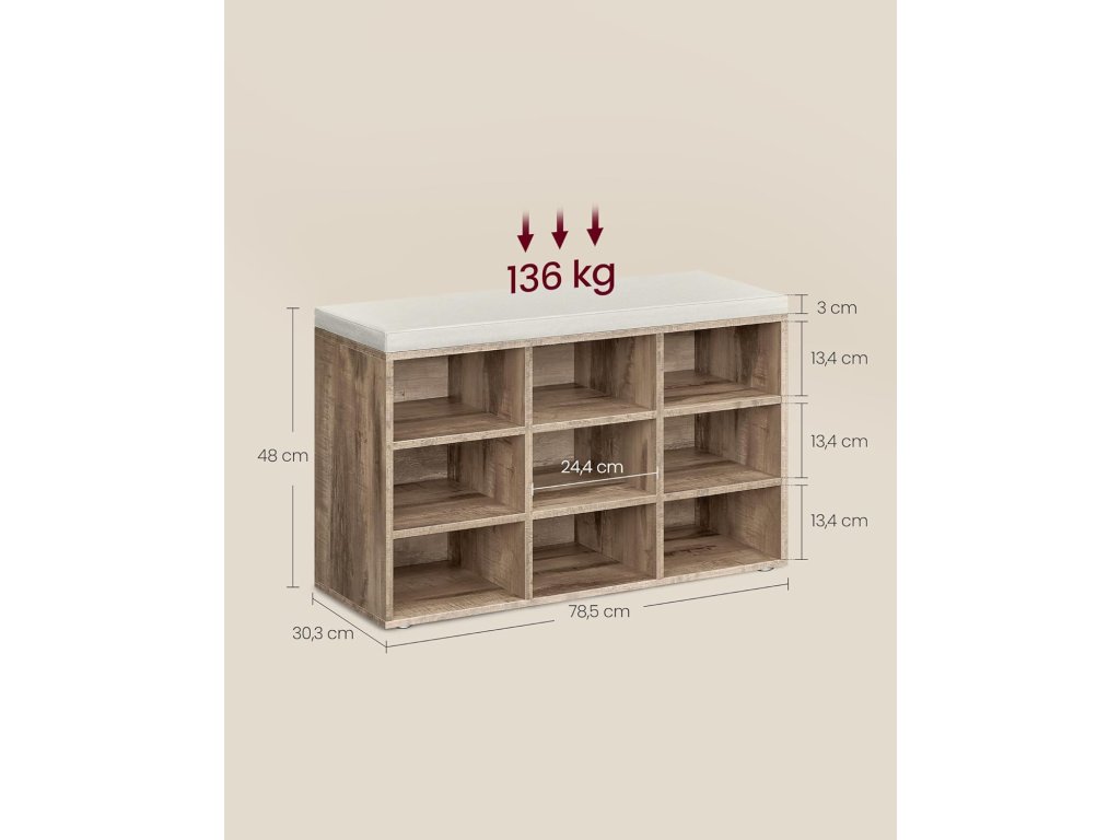 Vše je přehledné Tato lavice má 9 skříněk o rozměrech 29,7 x 24,5 cm (D x V), do kterých se vejde až 9 párů bot; Přepážky po stranách jsou nastavitelné a odnímatelné a poskytují více prostoru pro uložení bot a košíků;Robustní a stabilní Tato úložná lavice je vyrobena z 12mm dřevotřískové desky a unese až 300 kg, takže se nemusíte bát, že se při sezení převrhne. Šest podložek chrání podlahu před poškrábáním.Pohodlné sedadlo, snímatelný potah Polstrované sedadlo umožňuje pohodlné sezení. Polštářek připevněný pomocí suchých zipů lze snadno sejmout. Potah z lněné tkaniny se zipem je odnímatelnýSnadná montáž S montáží této lavičky na boty si nedělejte starosti. Očíslované díly a ilustrovaný návod vám pomohou ji snadno sestavit.Všestranné Ať už v předsíni jako lavice na boty, v obývacím pokoji jako odkládací police nebo na konci postele - tato praktická a stylová lavice se skvěle hodí.| Kategorie: | Lavice do předsíně |