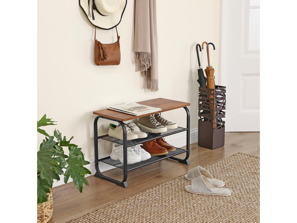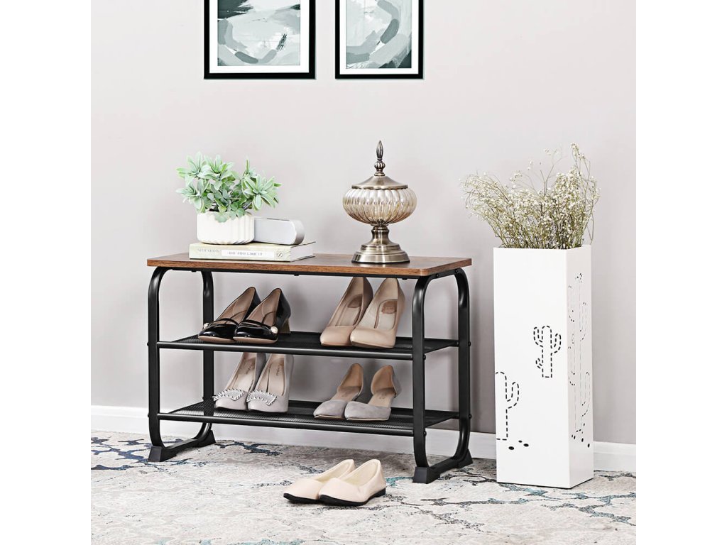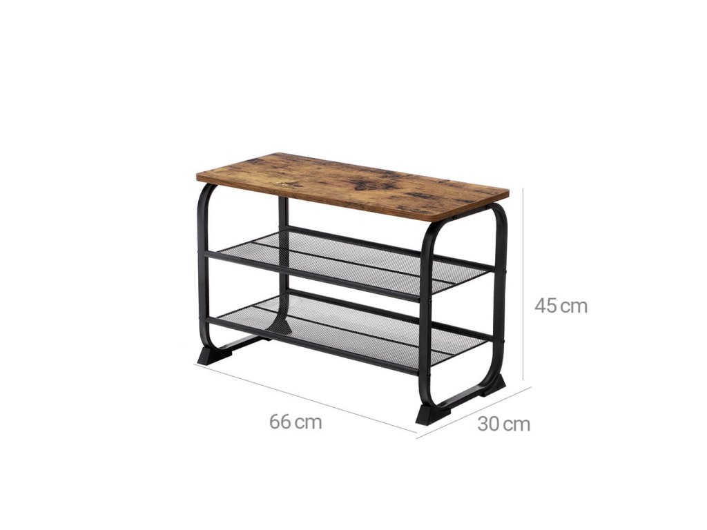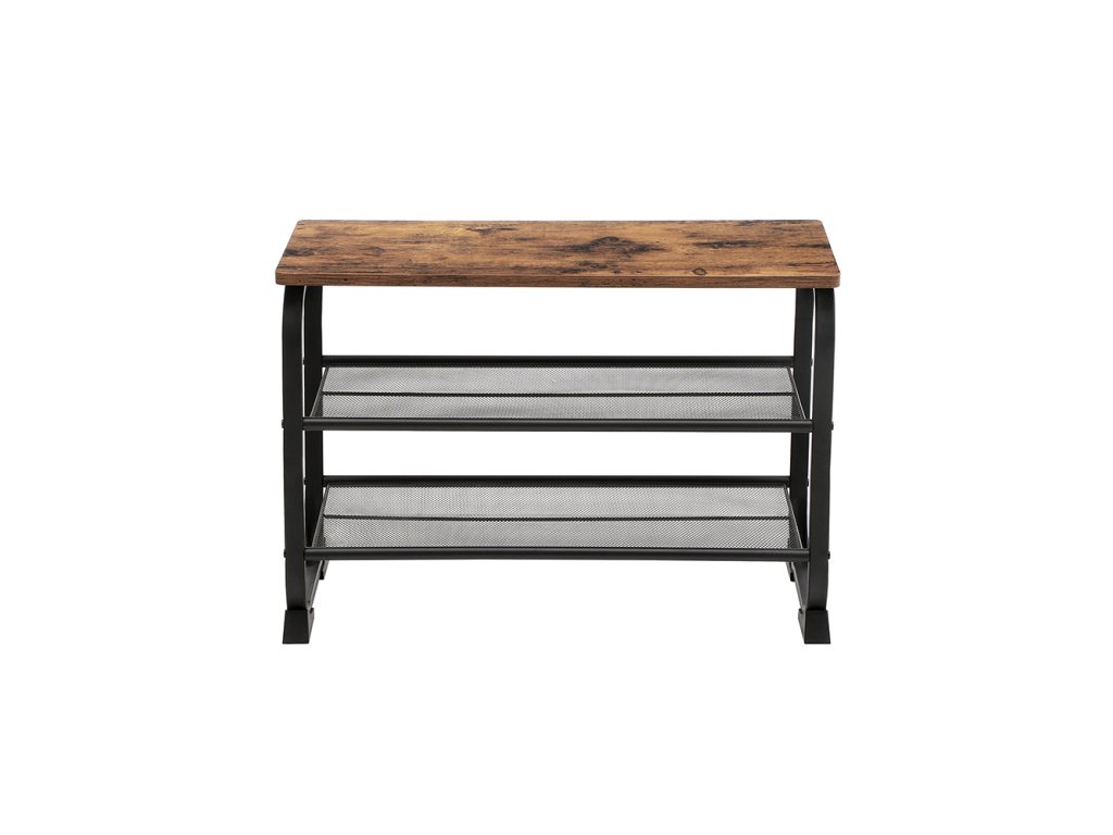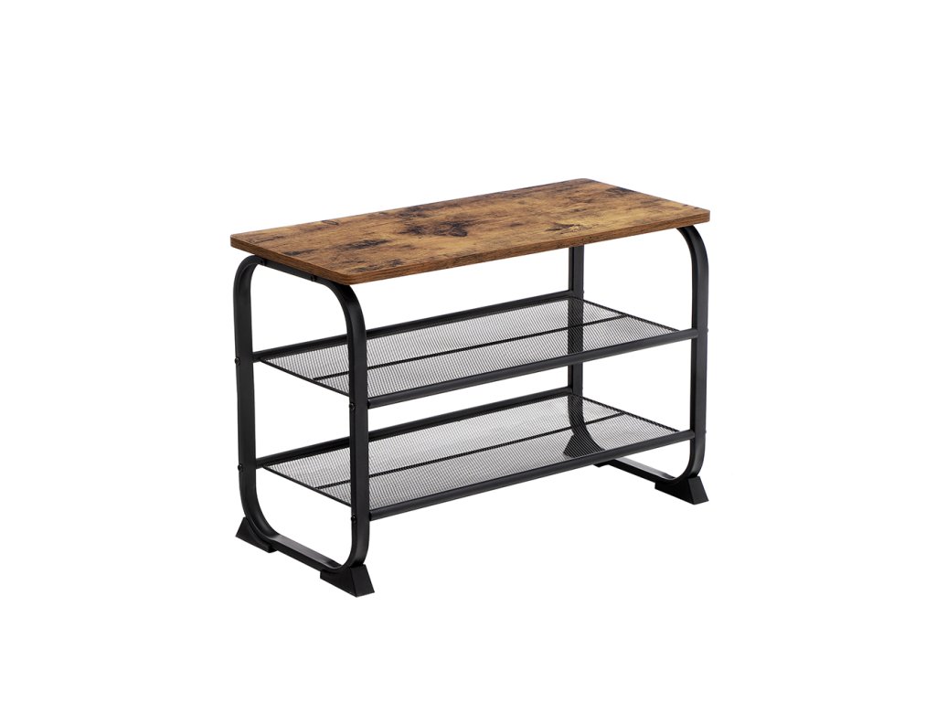 KRÁSNÉ KŘIVKY: Tato lavička na boty vylepší váš domov svým rustikálně laděným povrchem, zaoblenými rohy a zakřiveným ocelovým rámem - žádné ostré rohy!Všude se po něm shání: Prostorově úsporná police je vhodná nejen pro malé vstupní prostory, ale může také nabídnout další úložný prostor v obývacím pokoji nebo garáži. možná se dá použít i jako chytrý doplněk šatní skříně!JEHLOVÉ PODPATKY, TENISKY A SANDÁLY: Na dvě síťované police tohoto botníku se vejde až 6 párů bot; na povrch můžete pohodlně umístit kabelku.STABILNÍ MÍSTO PRO NĚKOHO, KDO ČEKÁ: Díky nosnosti až 90 kg je tato jednotka ideální také jako sedátko, takže se z obouvání nestane balancování. Speciálně navržené plastové nožičky jsou navíc velmi robustní a chrání podlahu před poškrábáním.JEŠTĚ NEJSTE SPOKOJENI? Montáž tohoto stojanu na boty je snadná a náš profesionální zákaznický servis je pro vás vždy otevřený. Tak neváhejte a doplňte svůj domov o tento flexibilní kus nábytku!