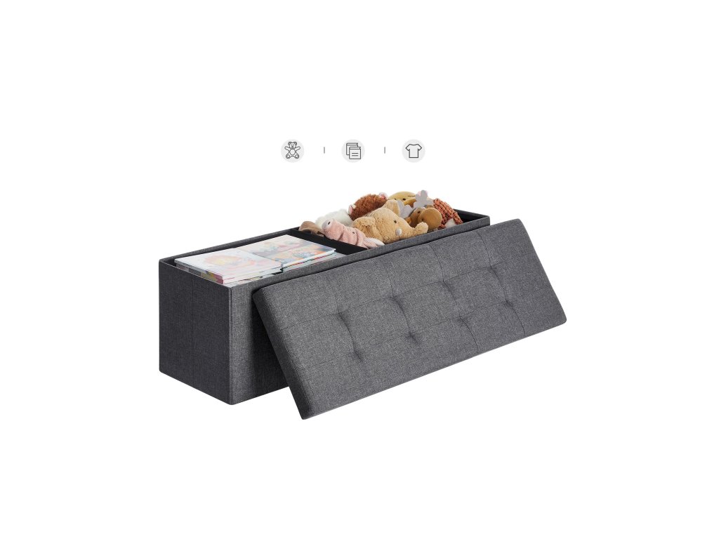 Lavice s úložným prostorem, sedací truhla, úložný box, skládací, max. statická nosnost 300 kg, s kovovou dělicí mřížkou, 120 l, 110 x 38 x 38 cm, imitace lnu.