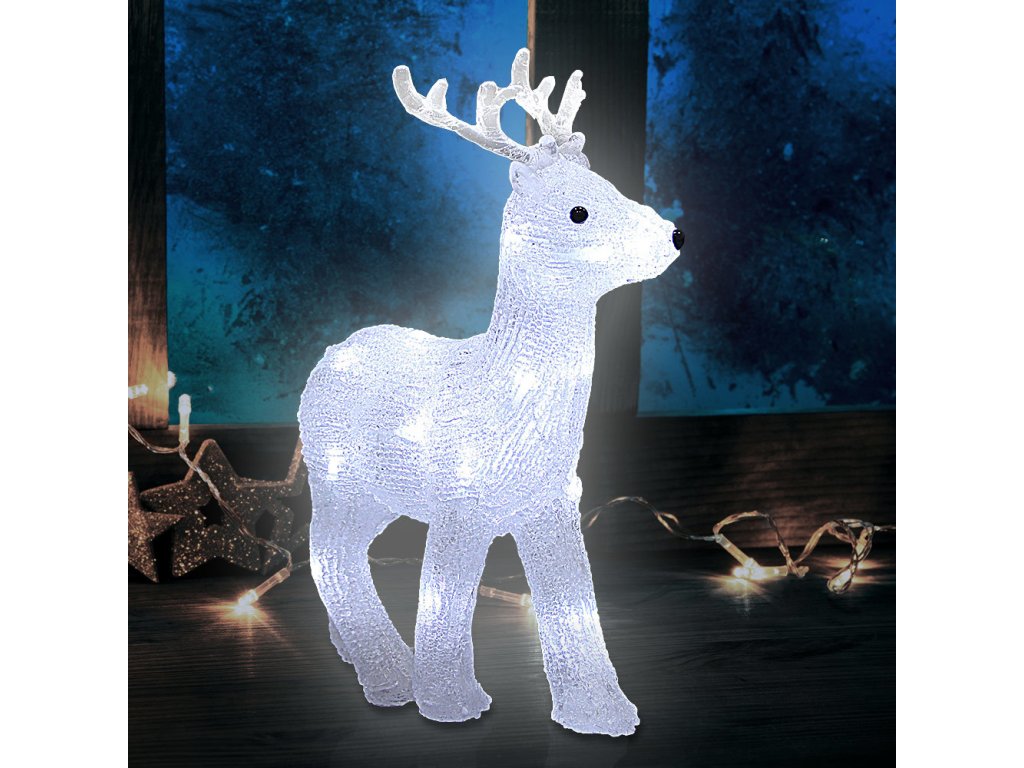 Akrylový LED jelen jasně svítí díky svým chladně bílým LED diodám. Je napájen 5 m dlouhým kabelem s adaptérem IP44. Figurka je vhodná pro vnitřní i venkovní vánoční použití a lze ji snadno čistit vlhkým hadříkem.