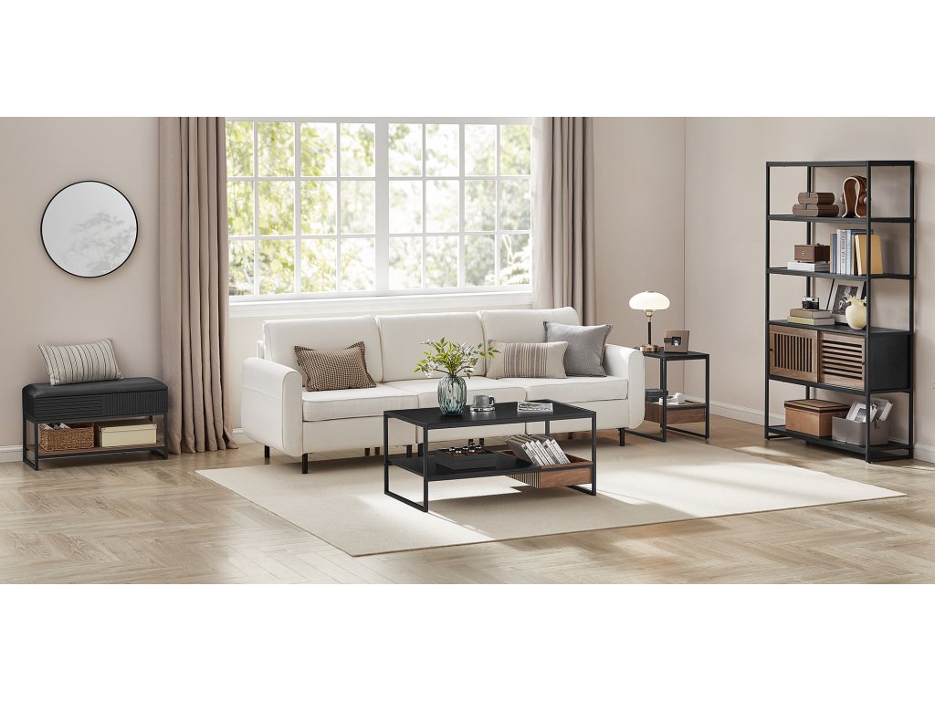 【Moderní design】Černý rám se vzorem dřeva ořechu Columbian činí tento konferenční stolek minimalistickým, ale elegantním. Mřížková dvířka skříňky mají design s protínajícími se liniemi.