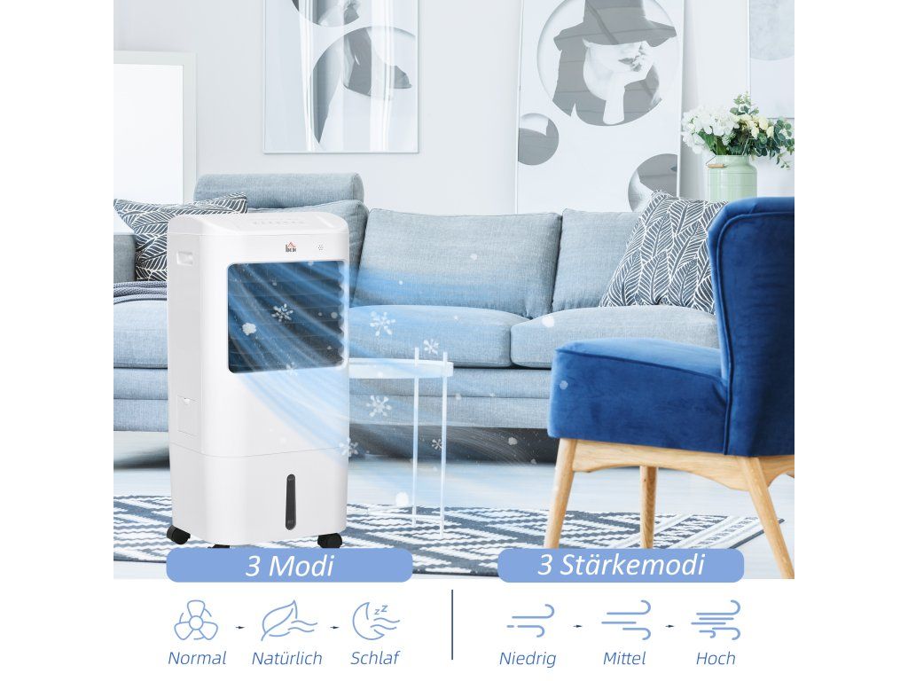 Zůstaňte v chladu: Tento přenosný chladič vzduchu pokrývá plochu 15-20 m² a lze jej nastavit na tři provozní režimy: chladný vzduch, chlazení ledem a zvlhčovač. Jeho technologie absorbuje teplo odpařováním vody, čímž poskytuje vlhčí vzduch a tím podporuje pohodlí pokožky. Díky 60stupňové oscilaci distribuuje vzduch do většího prostoru a rychle ochladí místnosti.