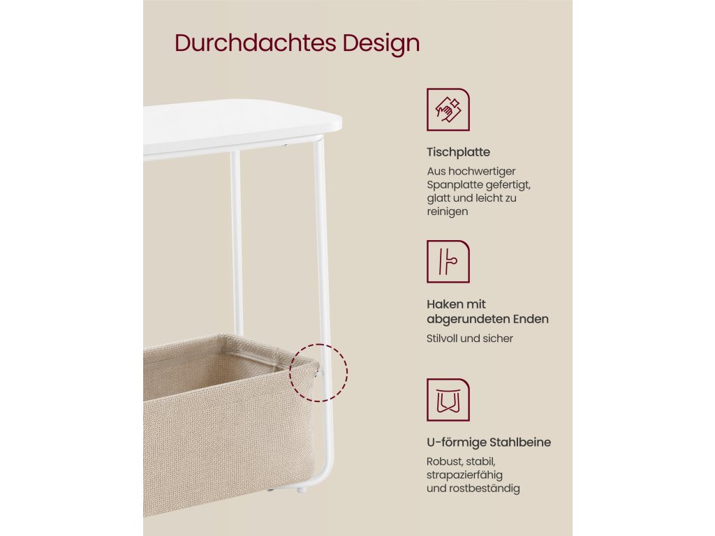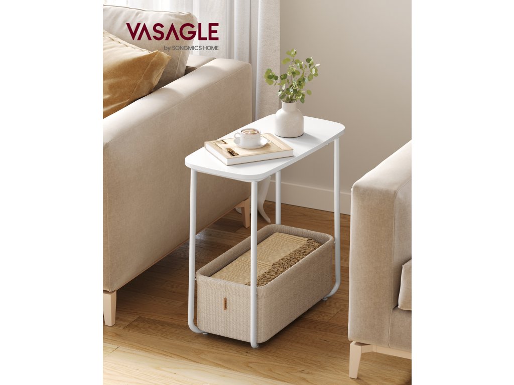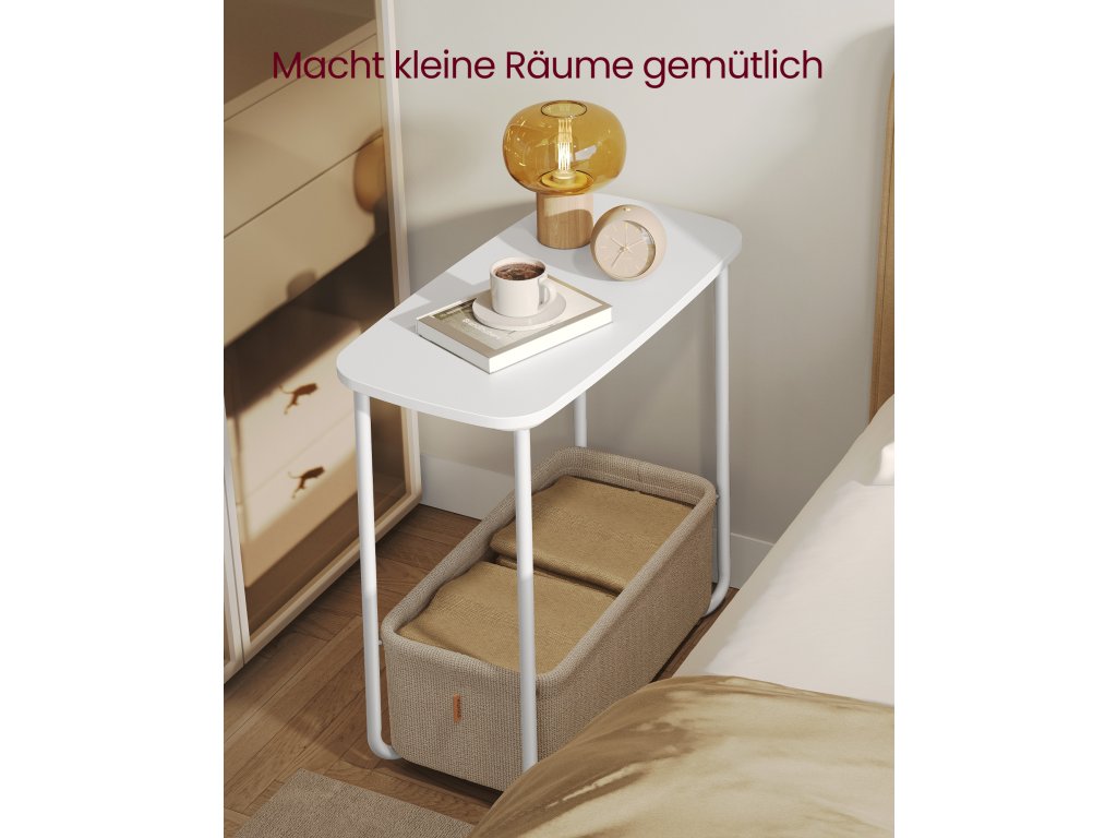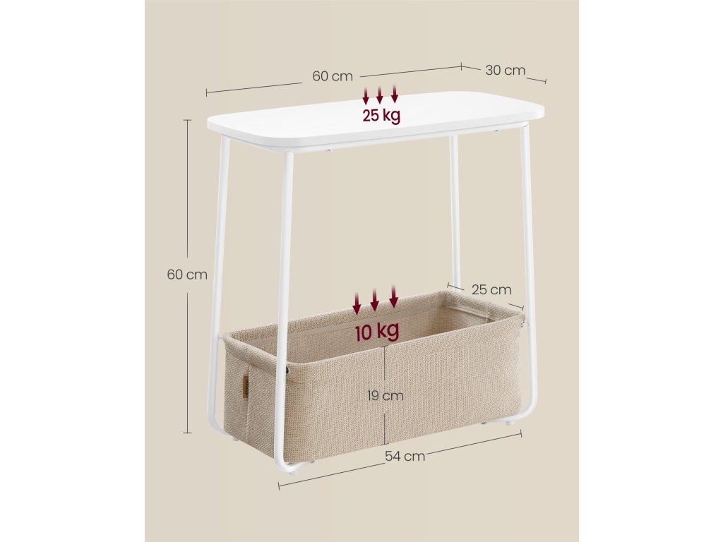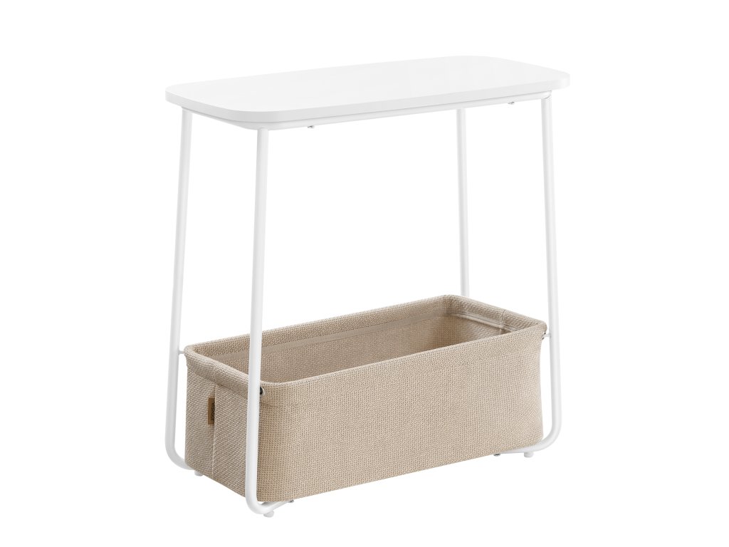 Malý kulatý odkládací stolek, moderní noční stolek s látkovým košem, matná bílá a velbloudí hnědá.