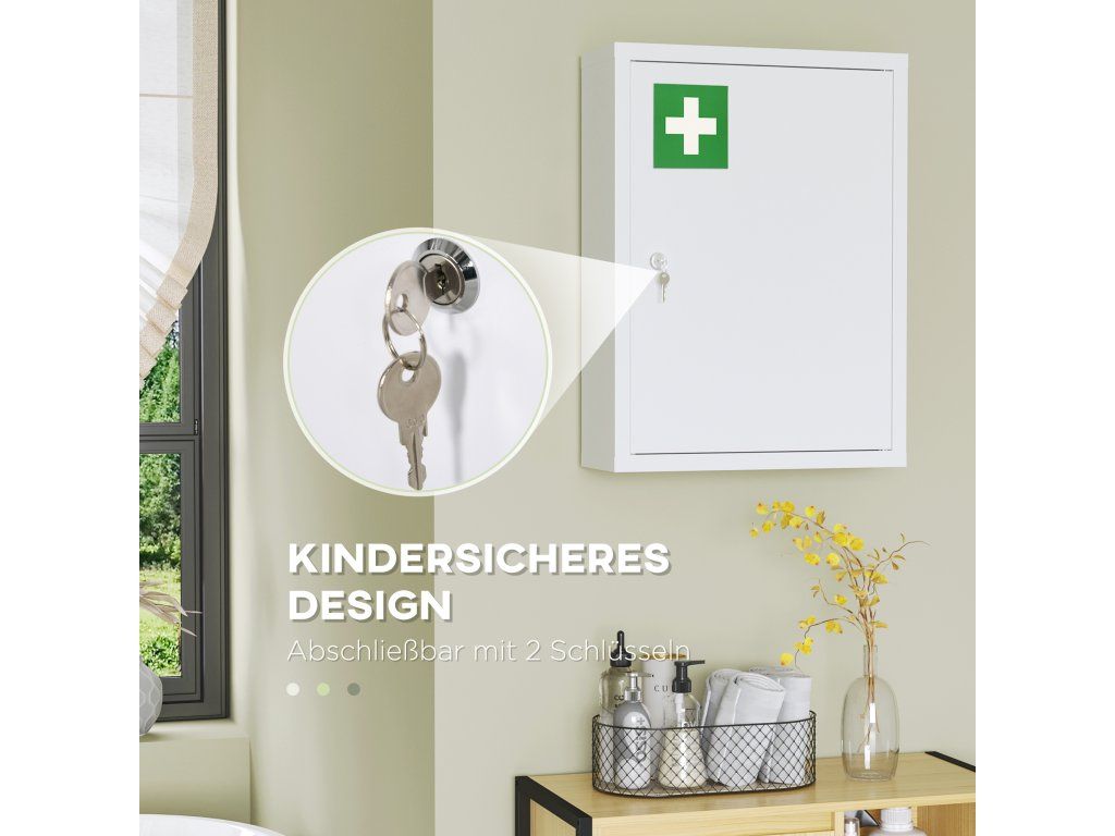 Uzamykatelná a bezpečná pro děti: Díky uzamykatelnému mechanismu a dvěma klíčům zajišťuje tato nástěnná skříňka bezpečné uložení léků a léků pro první pomoc mimo dosah dětí a domácích mazlíčků, což z ní činí ideální řešení pro rodiny.