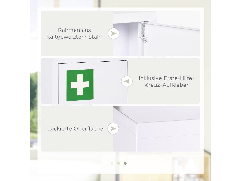 Odolná a snadno se čistí: Vyrobena z vysoce kvalitní za studena válcované oceli a potažená voděodolnou a korozivzdornou povrchovou úpravou, tato lékárnička zaručuje dlouhodobé používání i ve vlhkém prostředí, jako jsou koupelny.