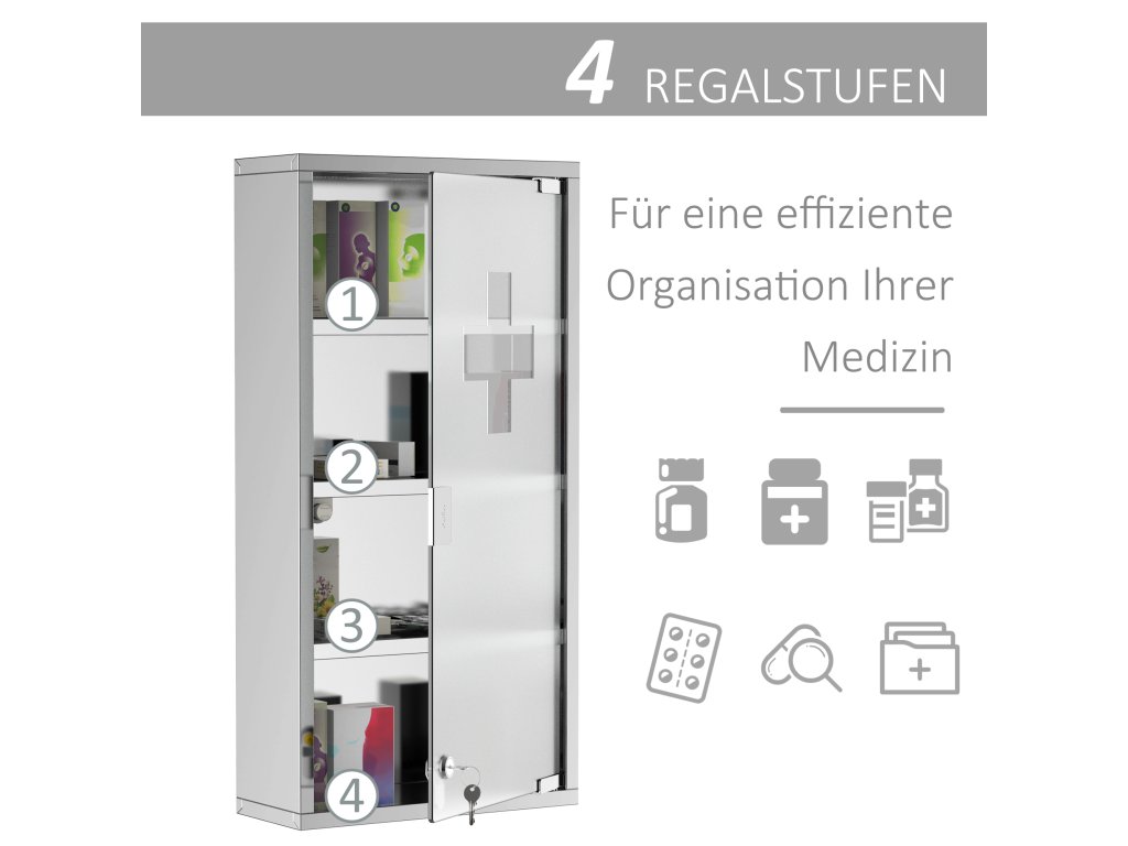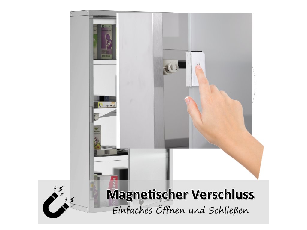 Uschovejte si svou malou domácí lékárničku s klidem v naší lékárničce. Vyrobena z vysoce kvalitní nerezové oceli, je odolná proti korozi a trvanlivá. Částečně matné skleněné dveře jsou uzamykatelné a mají mechanismus otevírání stisknutím, který umožňuje pohodlné otevírání jednou rukou. I bez dovedností kutilů můžete lékárničku snadno sestavit a namontovat na zeď, takže vaše léky budou bezpečně uloženy a snadno dostupné.