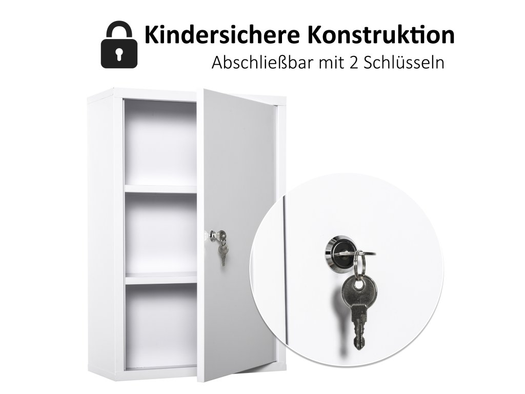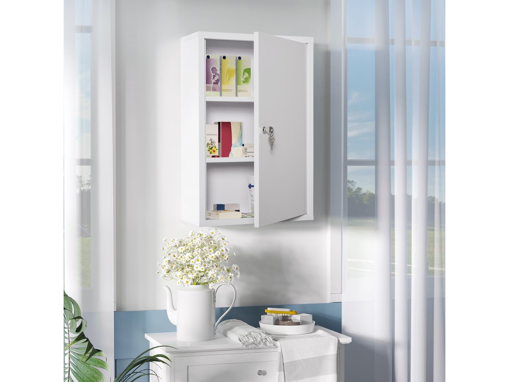 Uzamykatelná lékárnička Tato skříňka, vybavená dvěma klíči, je uzamykatelná, aby všechny lékárničky a léky byly mimo dosah a zabránily se jejich náhodnému použití. Ideální pro domácnosti s domácími mazlíčky a dětmi.