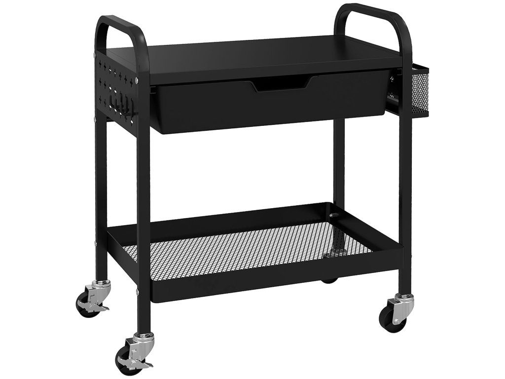 Tento pojízdný vozík je kompaktní, takže je ideální do malých prostor, které potřebují více úložného prostoru. Spodní police, zásuvka, boční háčky a malý košík nabízejí dostatek prostoru pro různé doplňky. Je vybaven hladce se otáčejícími rukojeťmi pro snadný pohyb a čtyřmi hladce se otáčejícími kolečky s aretačními brzdami, které vám umožní vozík přesunout kamkoli potřebujete. Lze jej použít jako servírovací vozík, kuchyňský vozík nebo víceúčelový vozík – praktické úložné řešení pro váš domov.