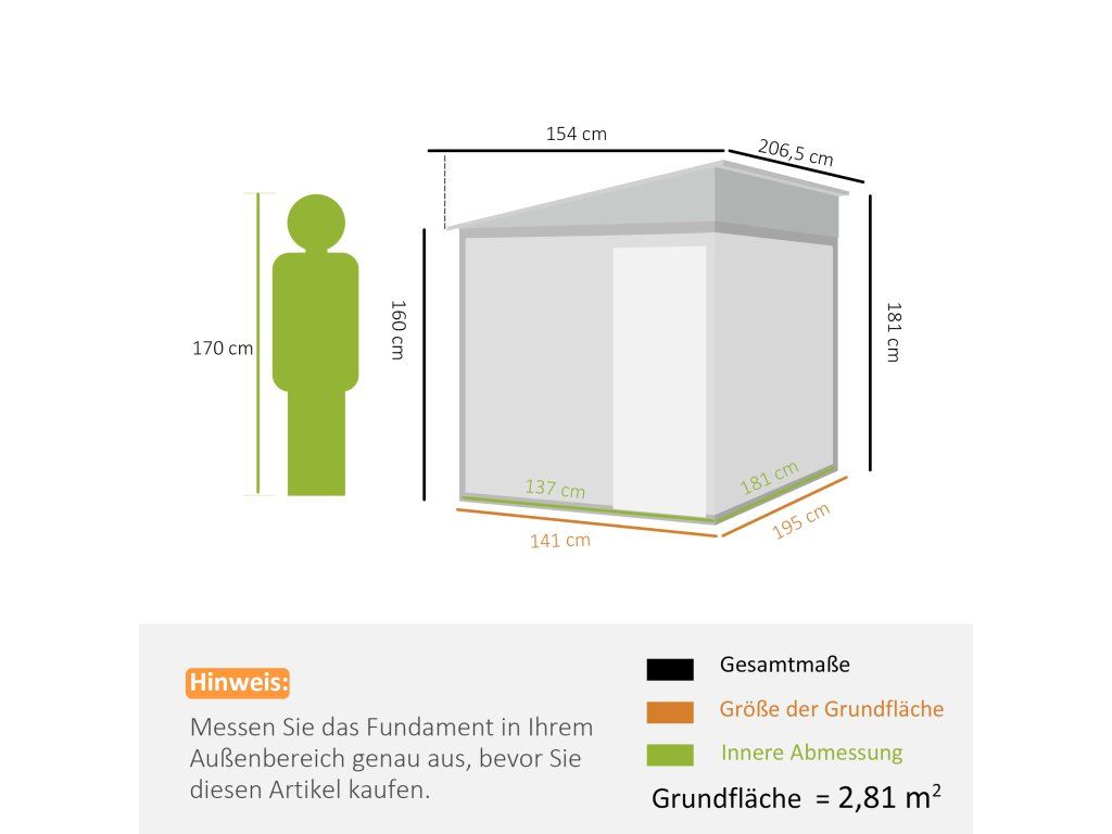 Rozměry zahradní kůlny: 154 x 206,5 x 160/181 cm. Vnitřní rozměry: 137 x 181 cm. Rukavice pro montáž jsou součástí dodávky. Doporučuje se montáž 2–3 osobami.