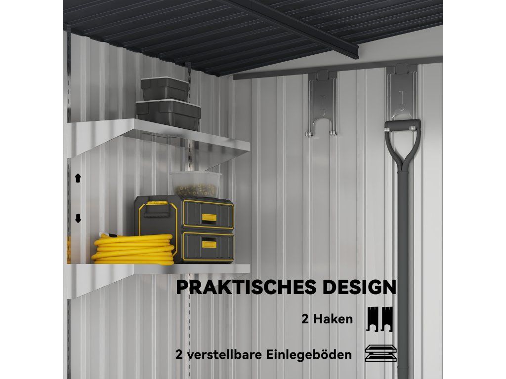 ✔ Dva háčky a dvě nastavitelné police uvnitř kovového zahradního domku.