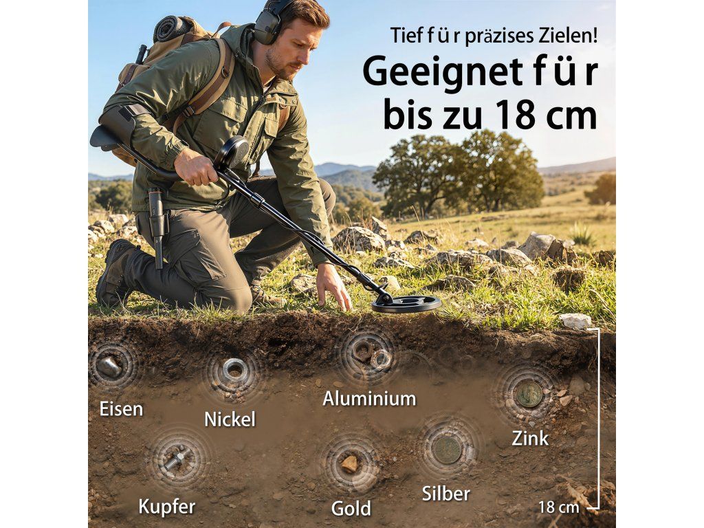 ✔ Detekuje předměty velikosti mince až do 18 cm pro hledání pokladů.