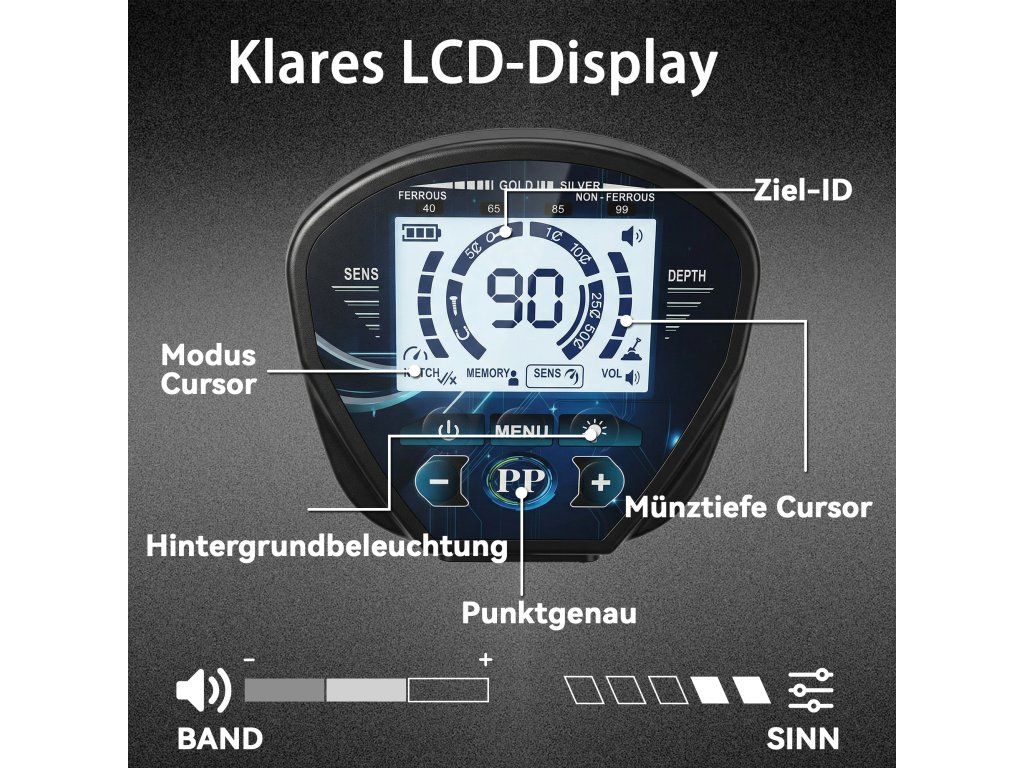 Intuitivní LCD displej: Jasný LCD displej zobrazuje režim vyhledávání, kategorii kovu a vzdálenost. I při slabém osvětlení zůstávají všechny informace snadno viditelné. S naším detektorem kovů můžete rychle identifikovat cíle a vyhnout se zbytečnému kopání.