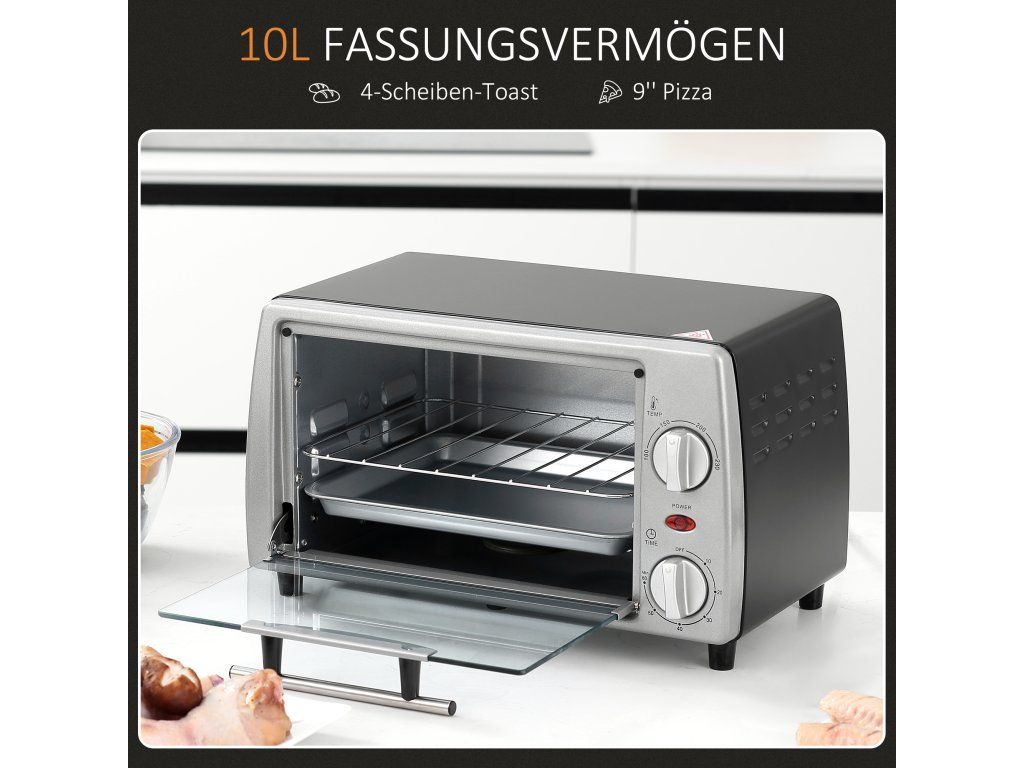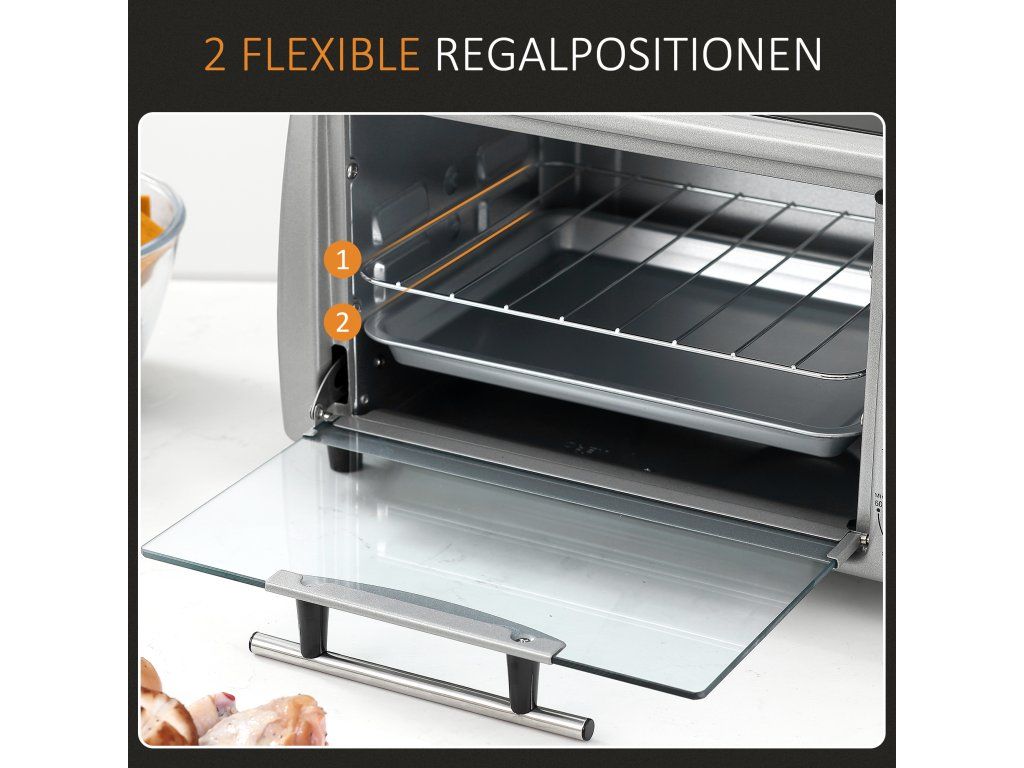 Příslušenství: Malá trouba je dodávána s jedním roštem a jedním plechem s rukojetí pro přípravu různých lahodných pokrmů. Spodní deska se snadno vyklopí pro snadné čištění.