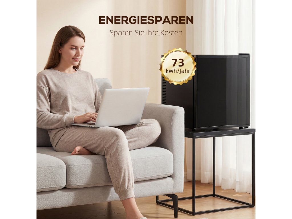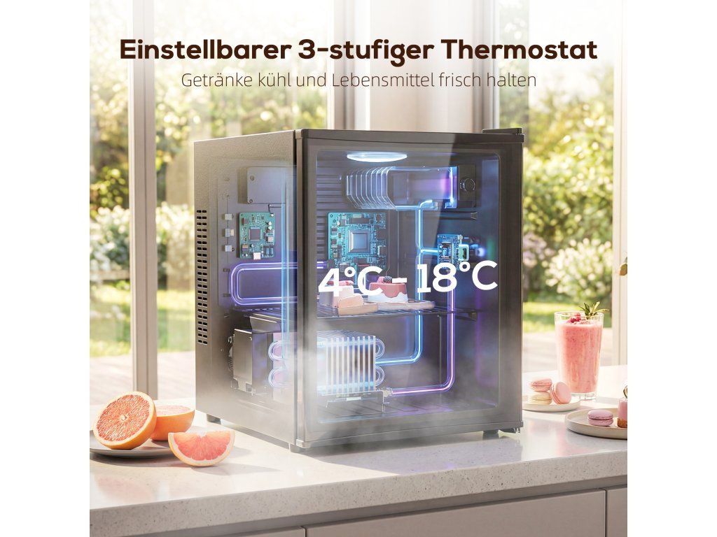Uživatelsky přívětivý design: Dveře s úhlem otevírání 135°, výškově nastavitelná vyrovnávací nožička a integrované LED vnitřní osvětlení zajišťují snadné umístění minichladničky a umožňují jasný přehled a pohodlný přístup za všech okolností.