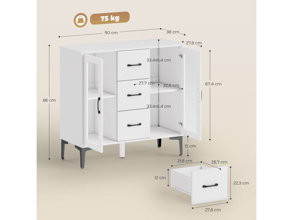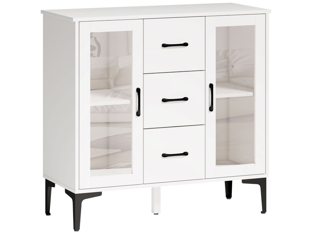 ✔ Bílá povrchová úprava s černými úchyty a nožičkami a skleněnými dvířky.