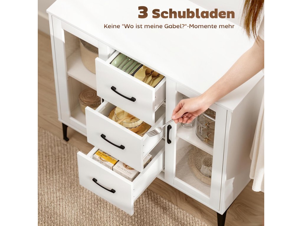 Světlý a příjemný vzhled: Díky svěží bílé povrchové úpravě, skleněným dvířkům a černým akcentům vyzařuje tato kuchyňská skříňka čistý, moderní styl. Je ideální do jídelen, kuchyní nebo obývacích prostor a díky čirým skleněným dvířkům jsou vaše věci viditelné a snadno se nacházejí.