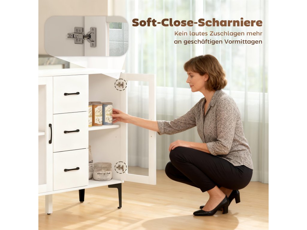 Tiché a bezpečné zavírání: Díky pantům s tlumeným zavíráním se dvířka tohoto kuchyňského příborníku zavírají jemně a tiše a chrání vaše prsty při každodenním používání – ideální pro živé domácnosti a pohodové večery.