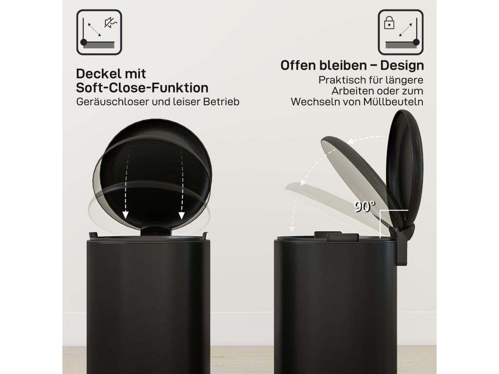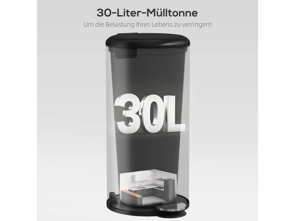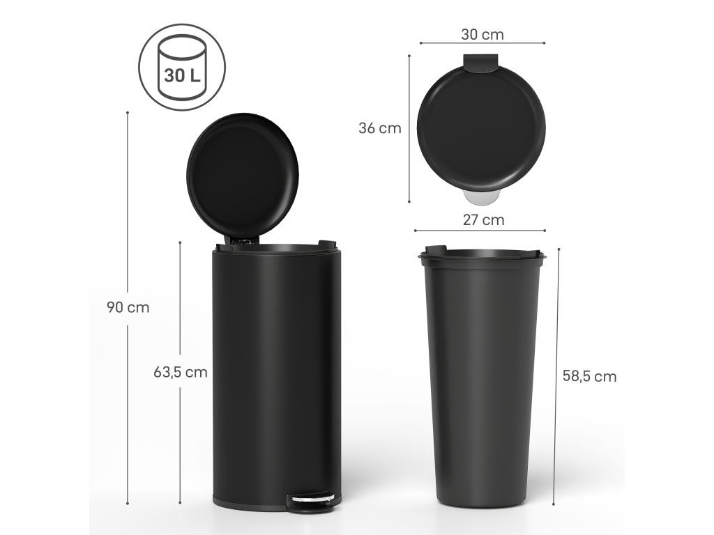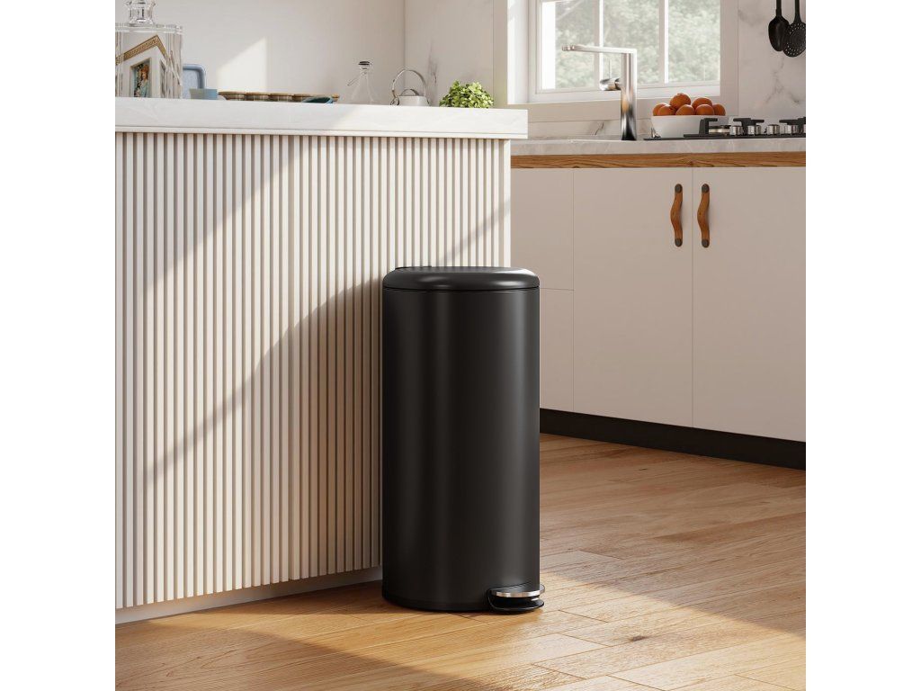 Objevte odpadkový koš: kompaktní, s objemem 30 litrů, ideální do každé místnosti. Tichý provoz díky víku s jemným zavíráním, ovládání bez použití rukou pomocí pedálu. Vyjímatelný vnitřní kbelík a otevíratelné víko usnadňují čištění a výměnu vložek do koše. Povrch odolný proti otiskům prstů udržuje koš s pedálem čistý a elegantní. Ideální do kuchyně, kanceláře nebo koupelny.