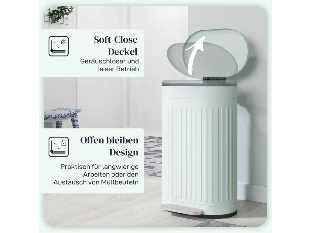 Ovládání pedálem s víkem s tlumeným zavíráním: Stačí na koš šlápnout a otevřít – nejsou potřeba žádné ruce! Funkce ponechání otevřené pozice usnadňuje vyprazdňování koše. Tiché zavírání bez rušení rodiny.