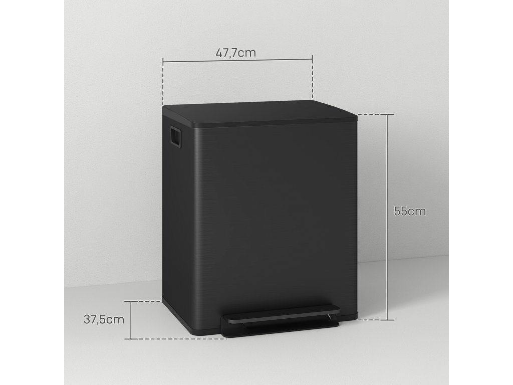 ✔ Dvě přihrádky o objemu 25 l pro třídění odpadu.
