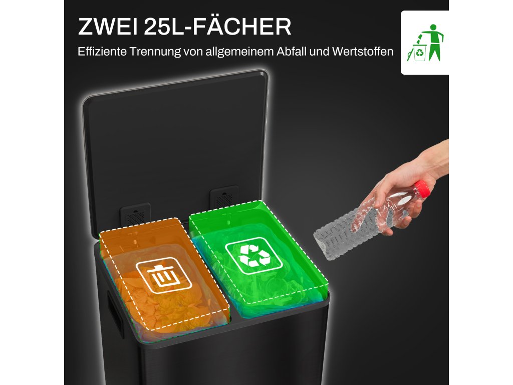 Dvojí použití pro třídění odpadu: Se dvěma přihrádkami o objemu 25 l je tento koš snadno tříděn s recyklovatelným odpadem od běžného odpadu. Přihrádky na deodorant odolné proti zápachu pomáhají eliminovat nepříjemné pachy (deodorant není součástí balení).