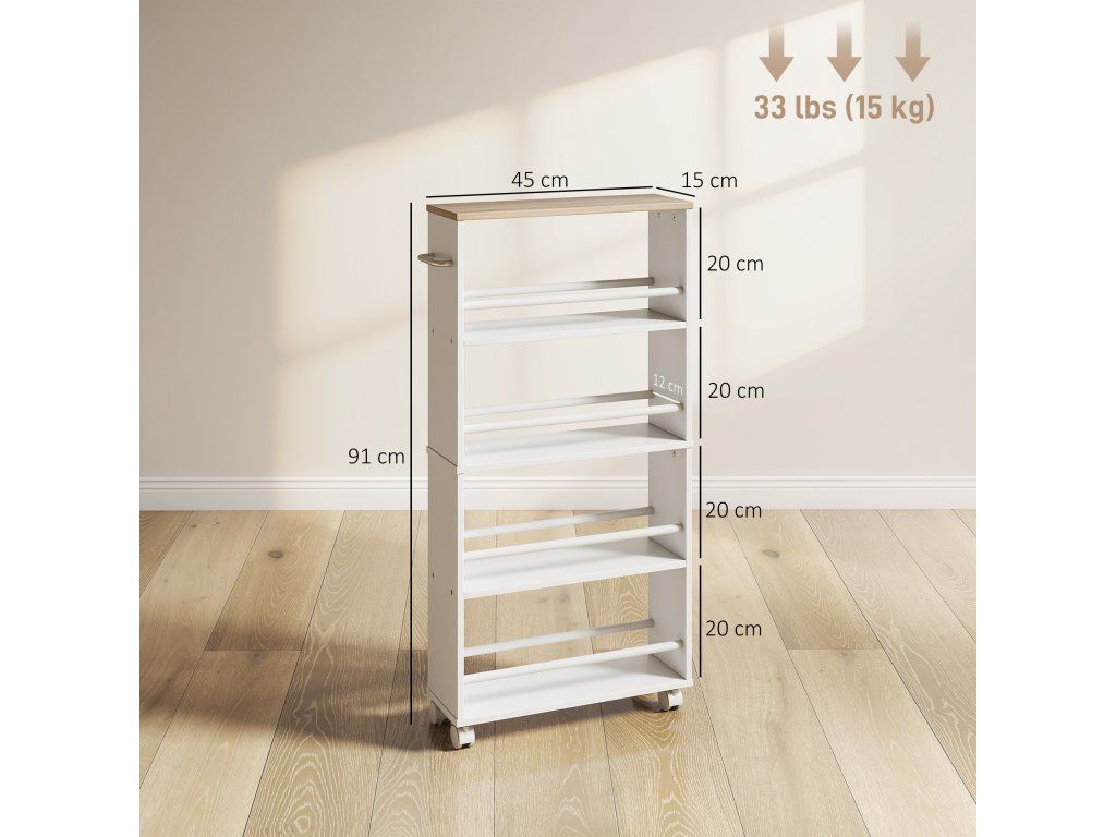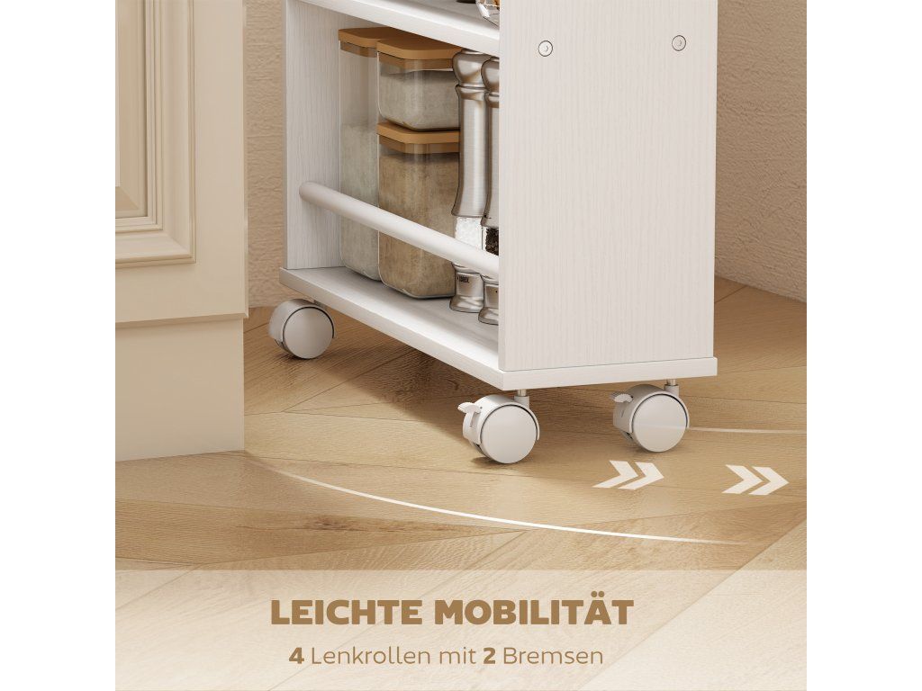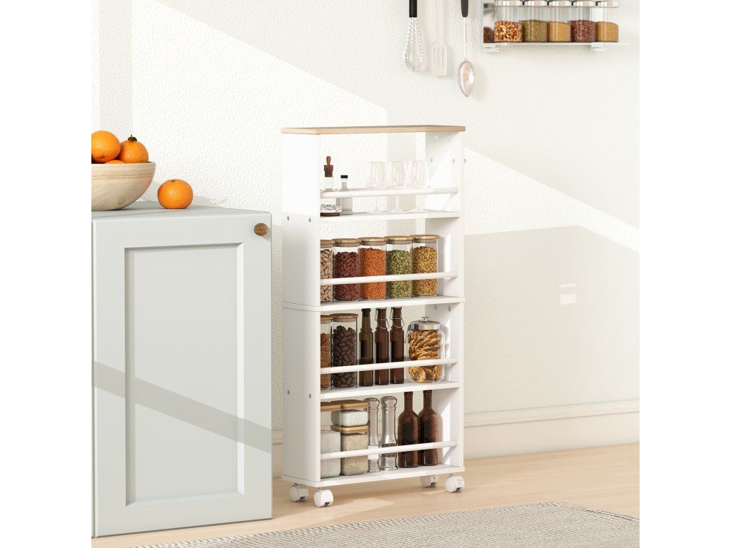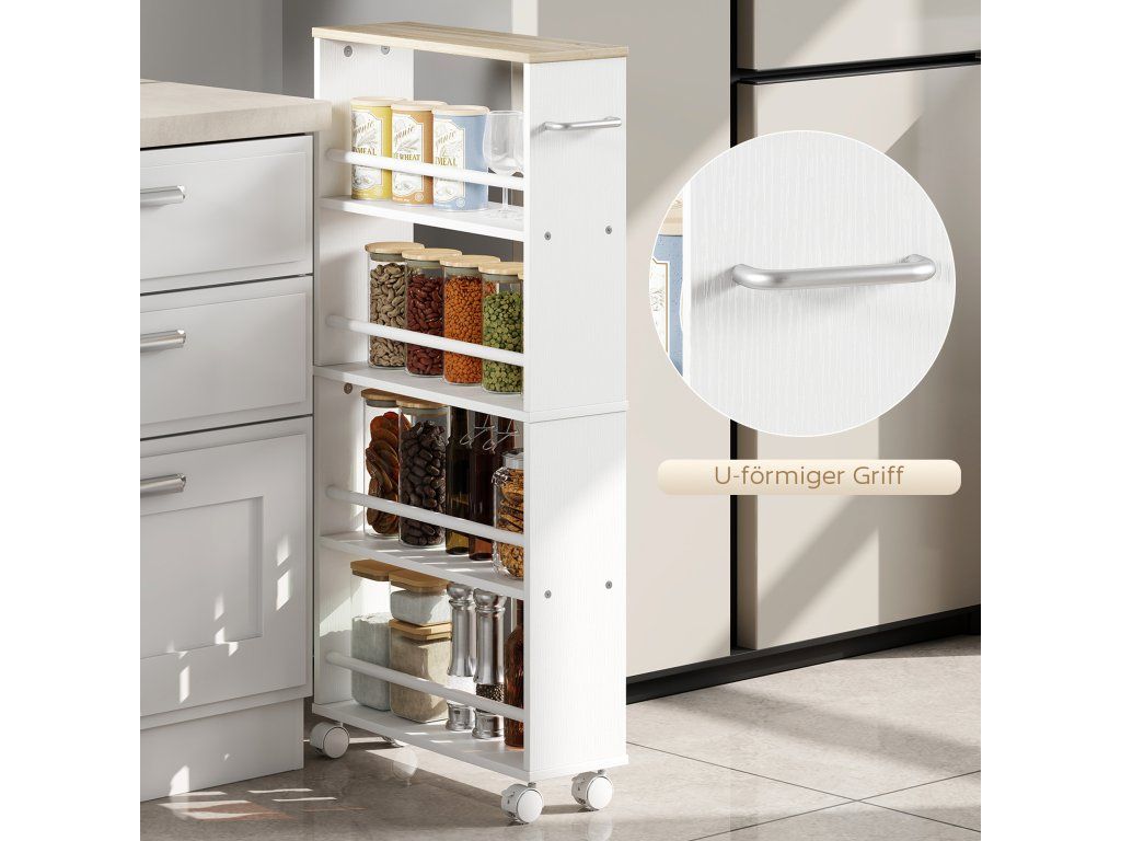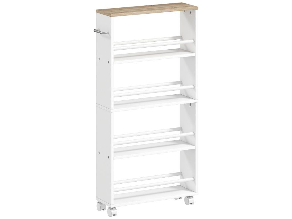 Prostorově úsporný design: Díky obzvláště úzké konstrukci se tento úložný vozík snadno vejde vedle lednice nebo jako praktická rohová police v prádelně. Efektivně využijte malé prostory a vytvořte si další úložný prostor.