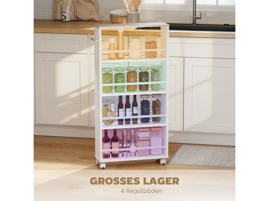 Všestranné úložné prostory: Díky čtyřem prostorným přihrádkám nabízí tento vozík na kolečkách dostatek prostoru pro úhledné uložení vašich věcí a udržení pořádku v domácnosti. Ideální do kuchyně, koupelny nebo obývacího pokoje.