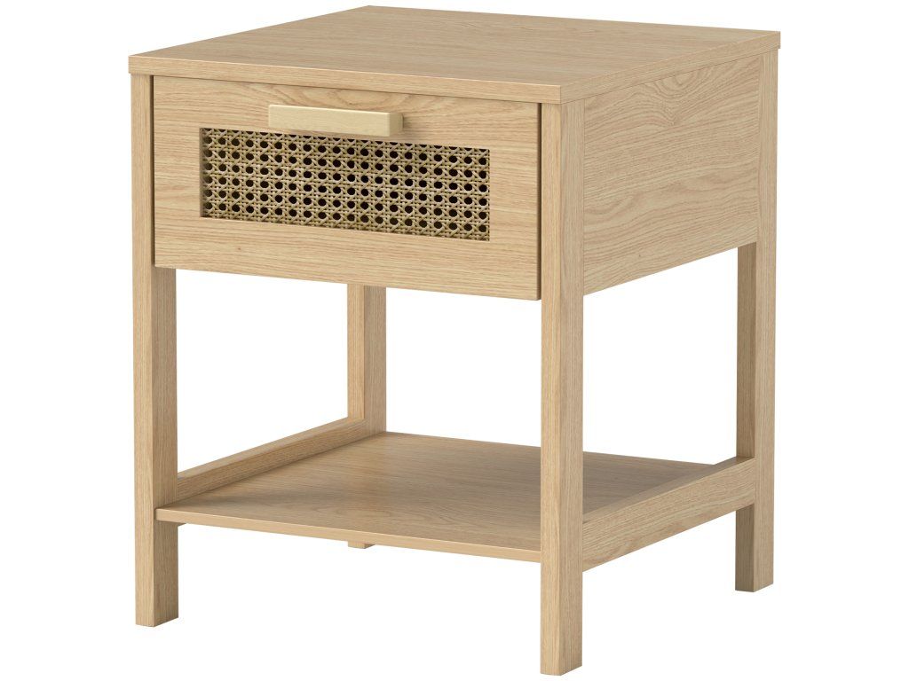 Díky tomuto nočnímu stolku je čas změnit styl vaší ložnice přirozeným způsobem. Má zásuvku a otevřenou poličku, takže snadno najdete všechny potřebné věci. Povrch zásuvky má ratanovou texturu, která tomuto odkládacímu stolku dodává elegantní, šik a rustikální design.
