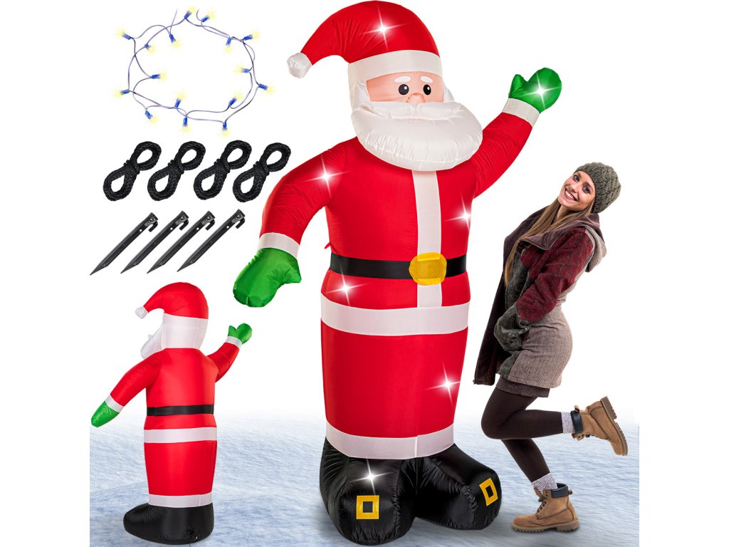 Prosvětlená nafukovací figurína Santa Clause vysoká 250 cm. Pomocí zabudovaného ventilátoru se dá velmi rychle nafouknout. Energeticky nenáročná poutavá vánoční dekorace vhodná do exteriérů i interiérů, výloh, prodejních prostor, školek a dětských zařízení k vytvoření vánoční a zimní atmosféry.