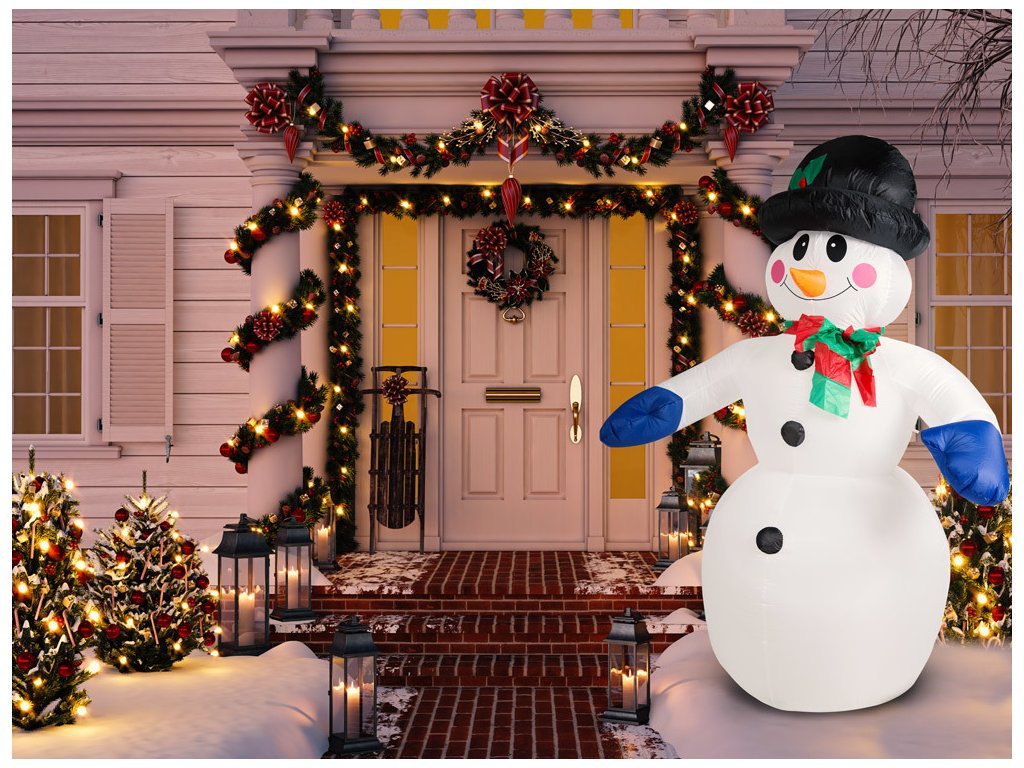 Prosvětlená nafukovací figurína sněhulák vysoká 240 cm. Energeticky nenáročná poutavá vánoční dekorace vhodná do exteriérů i interiérů, výloh, prodejních prostor, školek a dětských zařízení k vytvoření vánoční a zimní atmosféry.