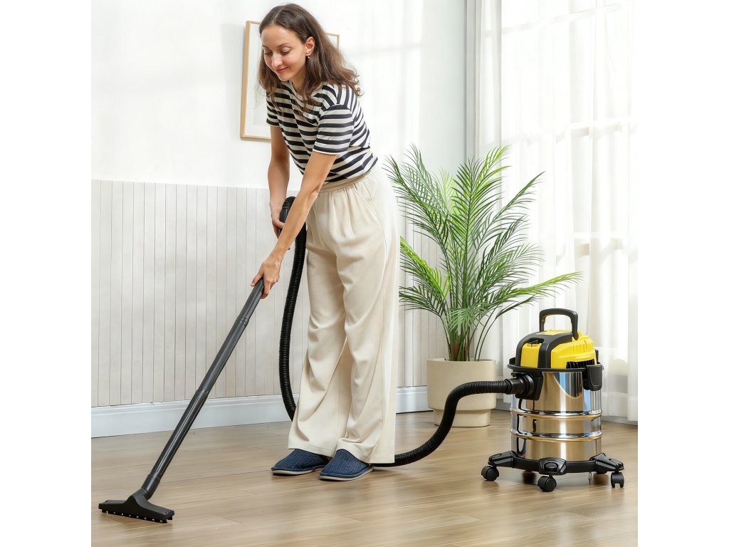 Všestranné čištění: Dodává se s podlahovou hubicí, štěrbinovou hubicí, kartáčem na čalounění, 2m hadicí a třemi prodlužovacími trubicemi, ideální pro čištění aut, dílen, garáží, ale i podlah a koberců. 3,6m dlouhý kabel vysavače umožňuje čištění velkých ploch bez častého odpojování ze zásuvky, což šetří čas a zvyšuje efektivitu.