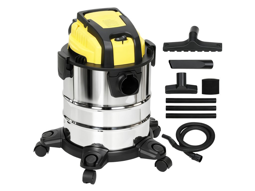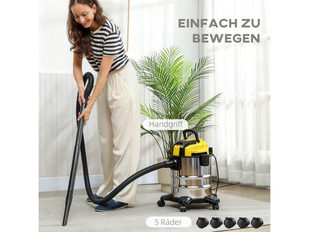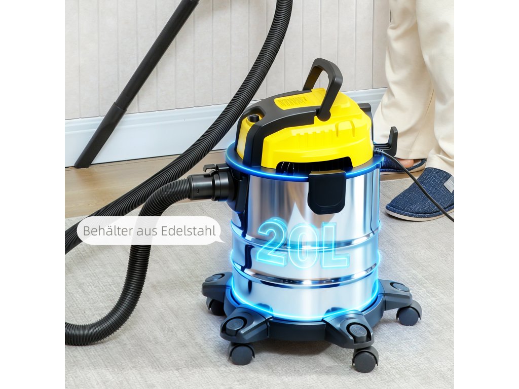 Vyzkoušejte multifunkční mokro-suchý vysavač: Ať už se jedná o mokré, suché vysávání nebo foukací zařízení – výkonný 1200W motor tohoto průmyslového vysavače zaručuje prvotřídní sací výkon a integrovaný chladicí systém chrání před přehřátím. Díky trojitému filtračnímu systému a robustní 20litrové nádobě z nerezové oceli si tento mokro-suchý vysavač bez námahy poradí s jakoukoli nečistotou. Díky své mobilitě je ideální pro důkladné čištění.