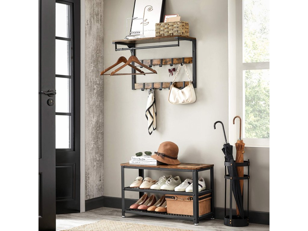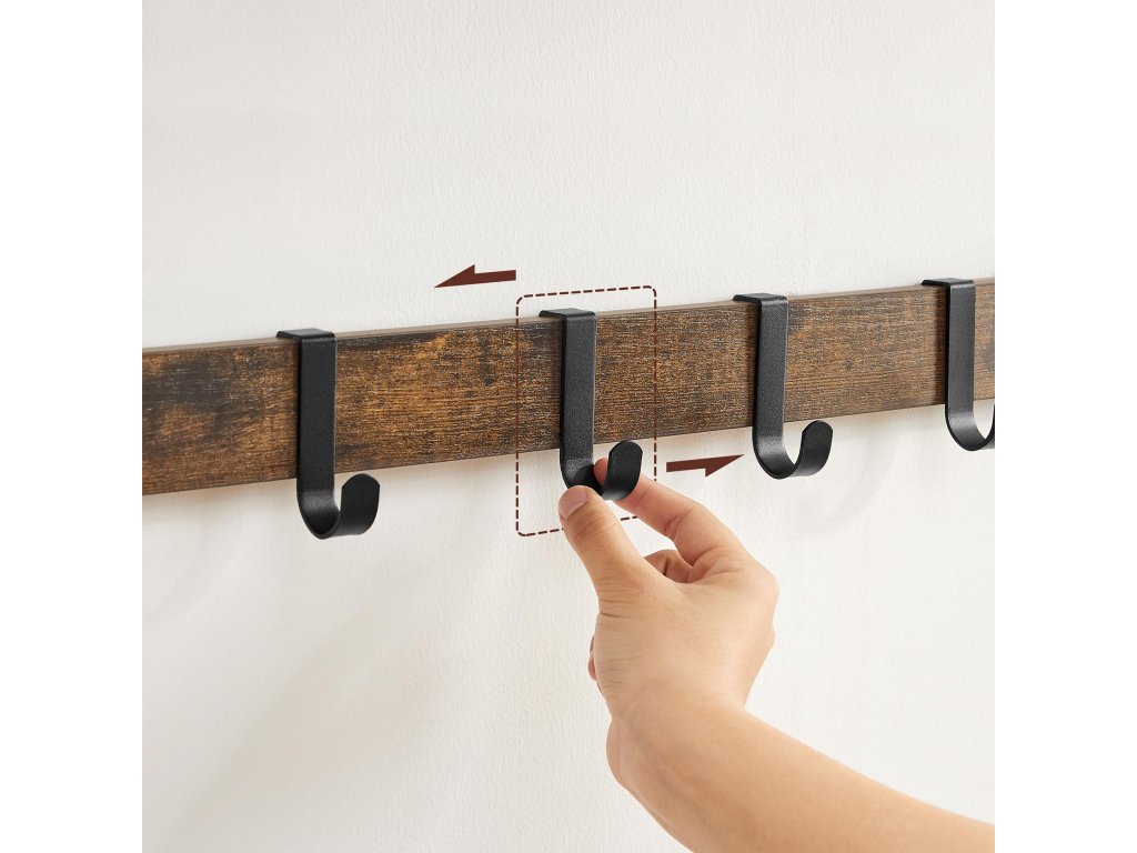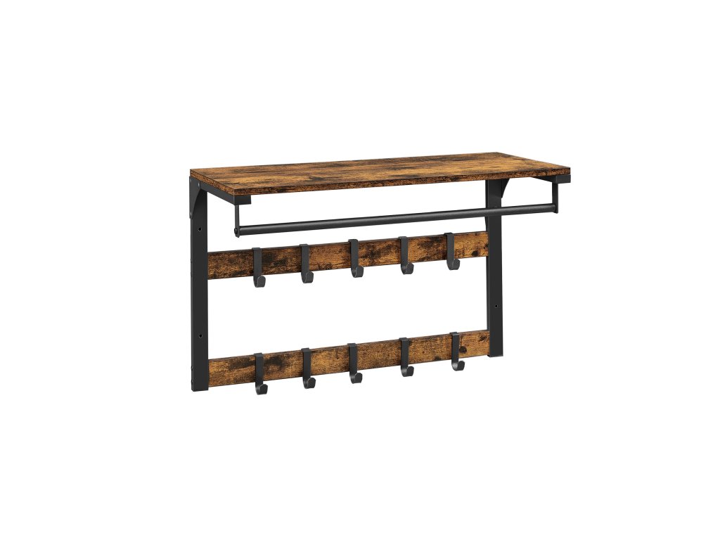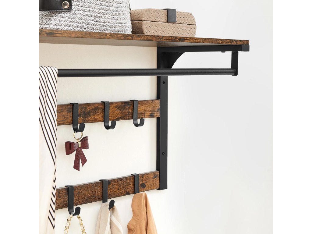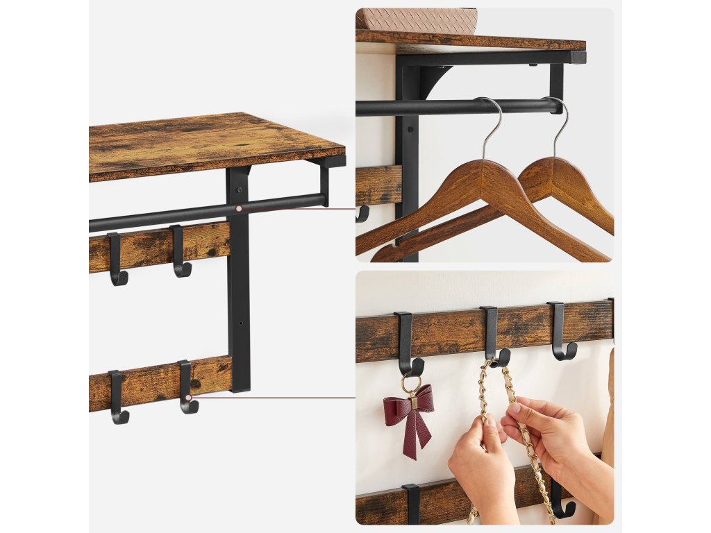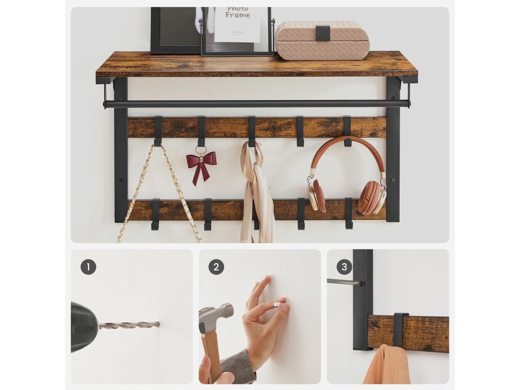 3 v 1 Díky horní polici, odnímatelnému háčku a závěsné tyči tento nástěnný věšák kombinuje úložný prostor, zavěšené oblečení a drobné předměty v jednom, aby vyhověl všem vašim potřebám.Vyjímatelné háčky Tento věšák má 10 vyjímatelných háčků ve dvou řadách, takže můžete nastavit vzdálenost mezi háčky v závislosti na zavěšených taškách, oděvech atd.Vysoká nosnost Tato závěsná police je vyrobena z odolné dřevotřísky a kovového rámu a má nosnost 16 kg pro polici, 4 kg pro každý háček a 20 kg pro tyč.Průmyslový design Tento nástěnný věšák o rozměrech 30 x 65 cm v rustikální hnědé barvě poskytuje další úložný prostor a zdobí stěnu v průmyslovém stylu.Snadná instalace: nemusíte se bát instalace. Díky očíslovaným dílům a jasnému návodu můžete tuto nástěnnou polici sestavit bez obtíží.| Kategorie: | Věšáky na zeď |