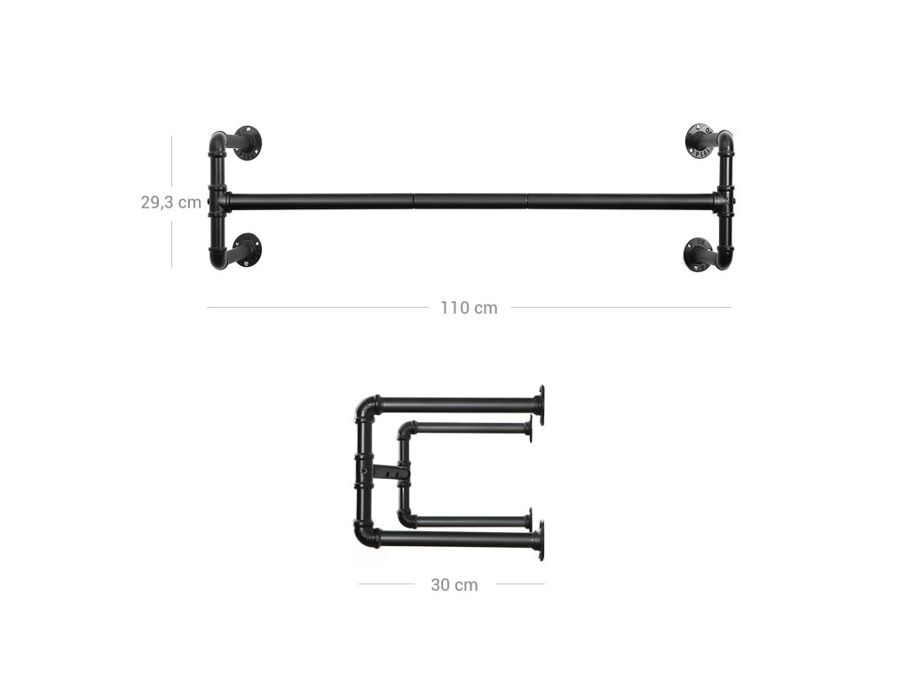 Nástěnný věšák na oblečení, průmyslový trubkový věšák na oblečení, šetří místo, 110 x 30 x 29,3 cm, nosnost až 60 kg, snadná montáž, pro malé prostory, černý.