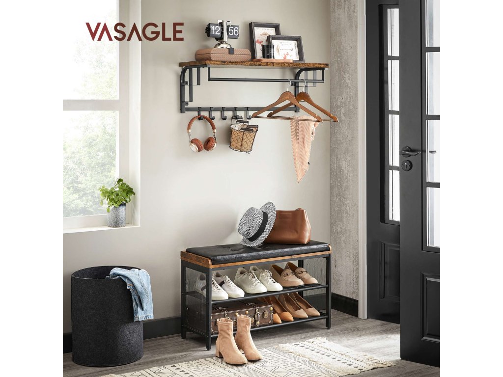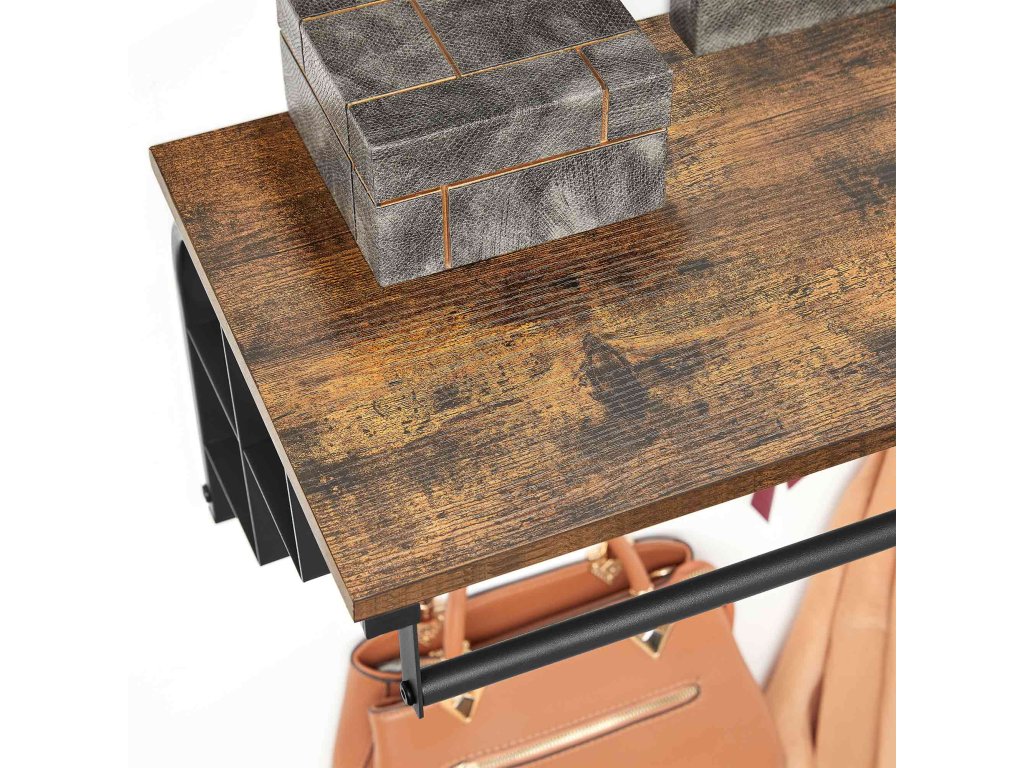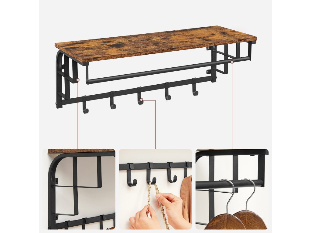 Nástěnný věšák s 5 odnímatelnými háčky na oděvy, plovoucí police se závěsnou lištou, do předsíně, ložnice, obývacího pokoje, rustikální hnědá a černá.