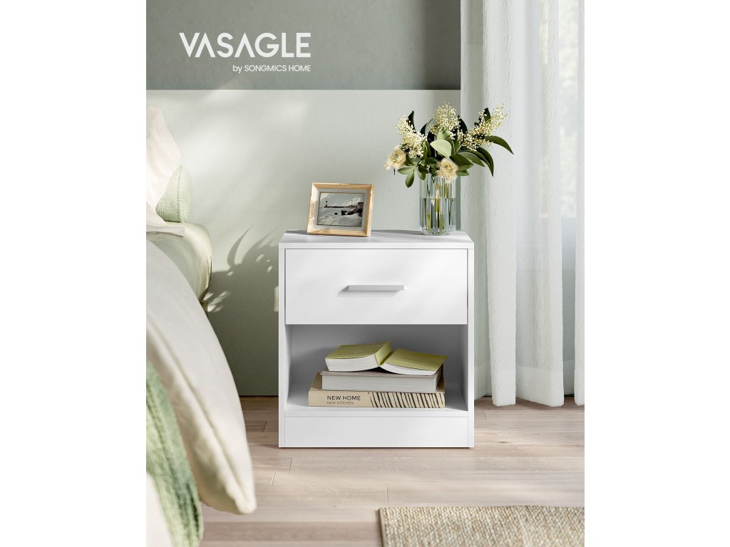 Noční stolek, noční stolek se zásuvkou, rukojetí, otevřenou přihrádkou, koncový stolek, do ložnice, obývacího pokoje, klasický bílý.