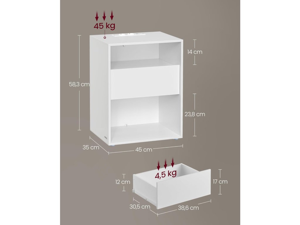 Elegantní moderní styl u vás doma: zkrášlete svůj pokoj tímto moderním a minimalistickým nočním stolkem. Jeho čisté linie a matná bílá barva působí moderním a elegantním dojmem a jsou ideální pro vytvoření klidné a relaxační atmosféry.【Silný a všestranný】Noční stolek je vyroben z kvalitní dřevotřísky, je odolný a pevný, unese až 130 kg. Díky kompaktním rozměrům 35 x 45 x 58,5 cm jej lze použít jako odkládací stolek nebo na konci pohovky.