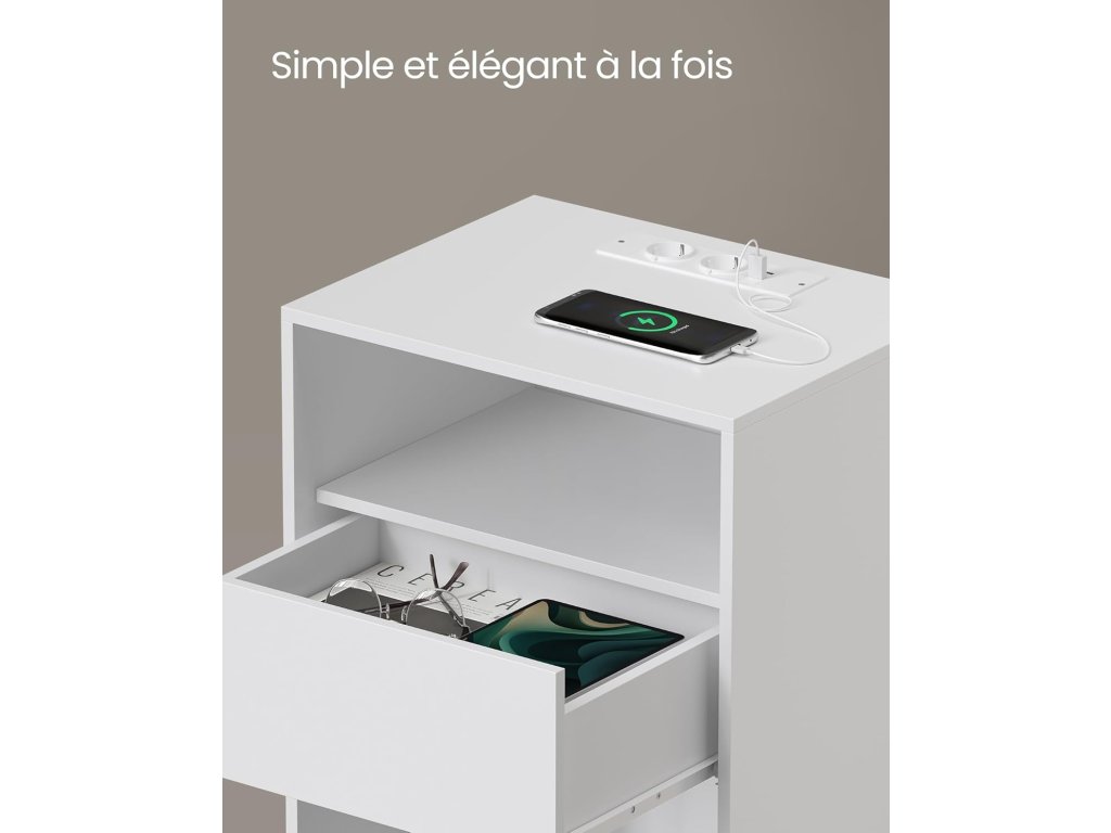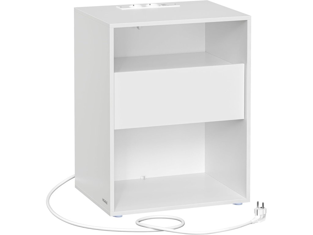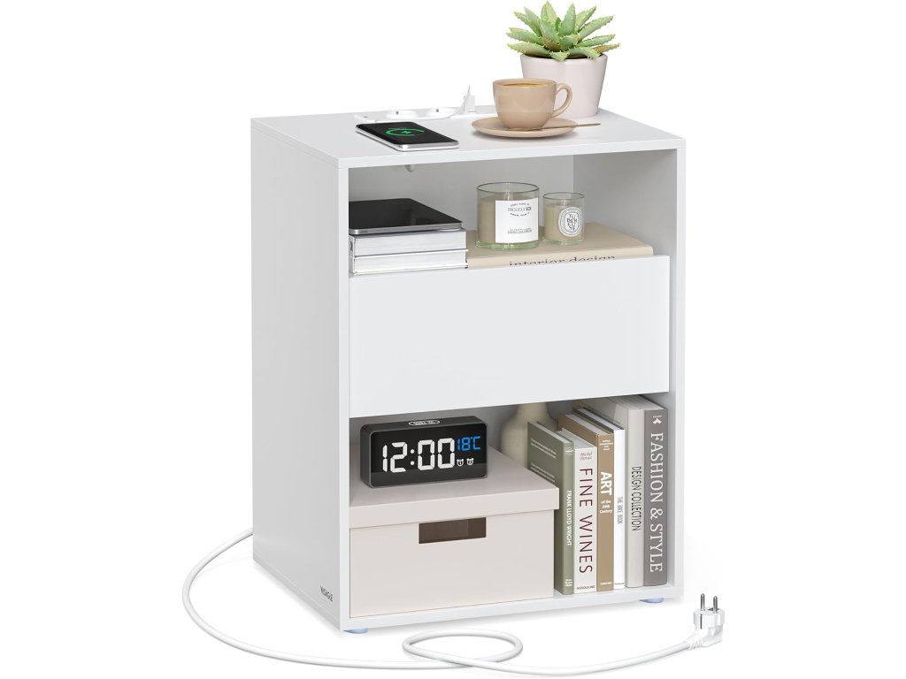 Noční stolek, montáž bez použití nářadí, noční stolek s napájecí lištou a zásuvkou, moderní, ložnice, obývací pokoj, matně bílý.