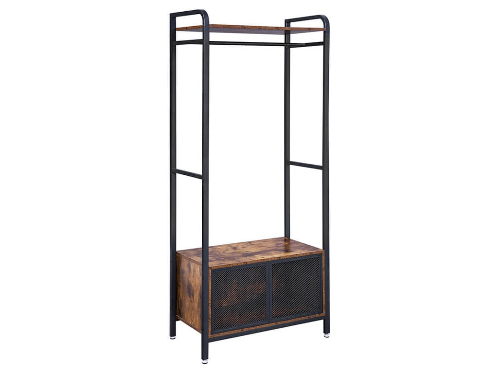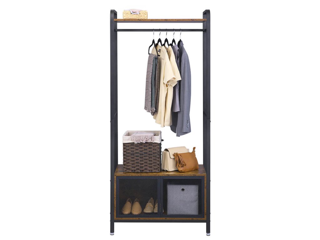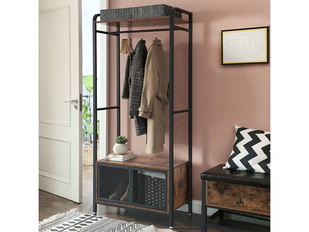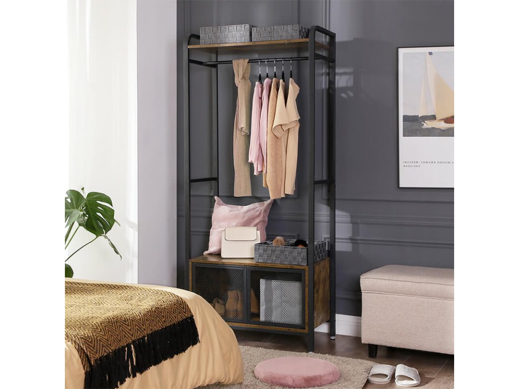 Otevřená šatní skříň se skříňkou v rustikální hnědo-černé barvě.