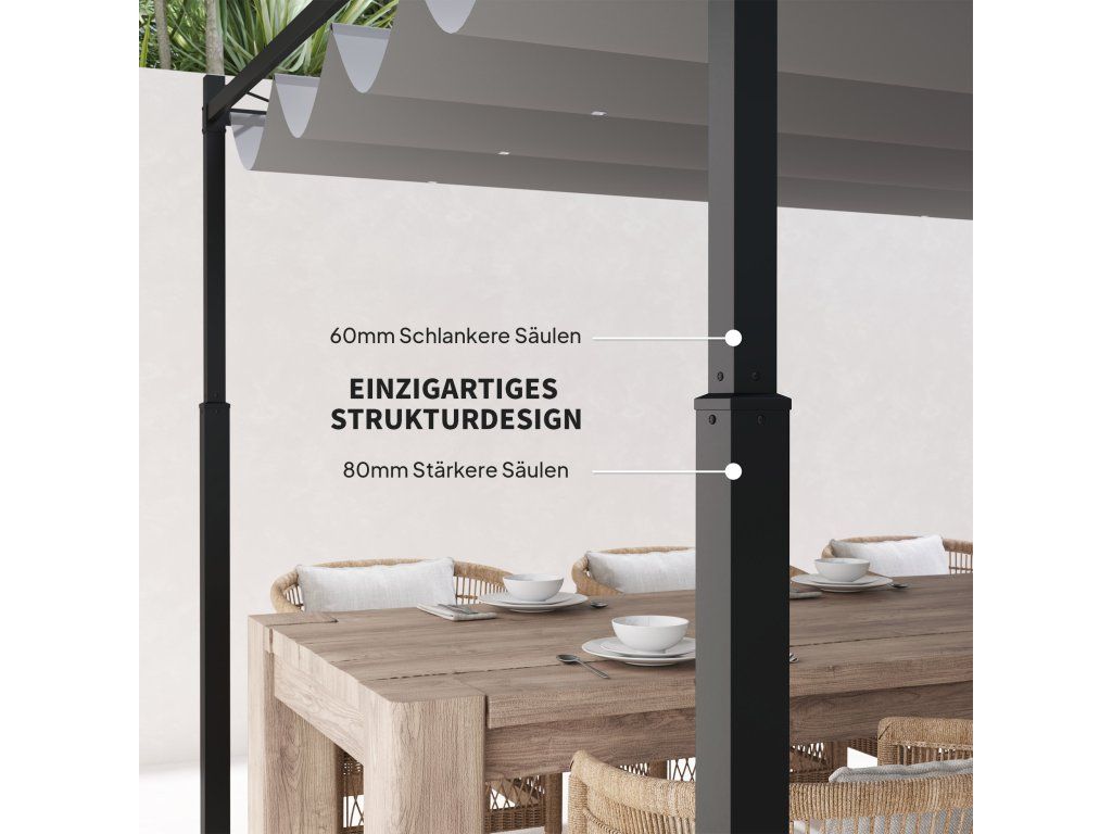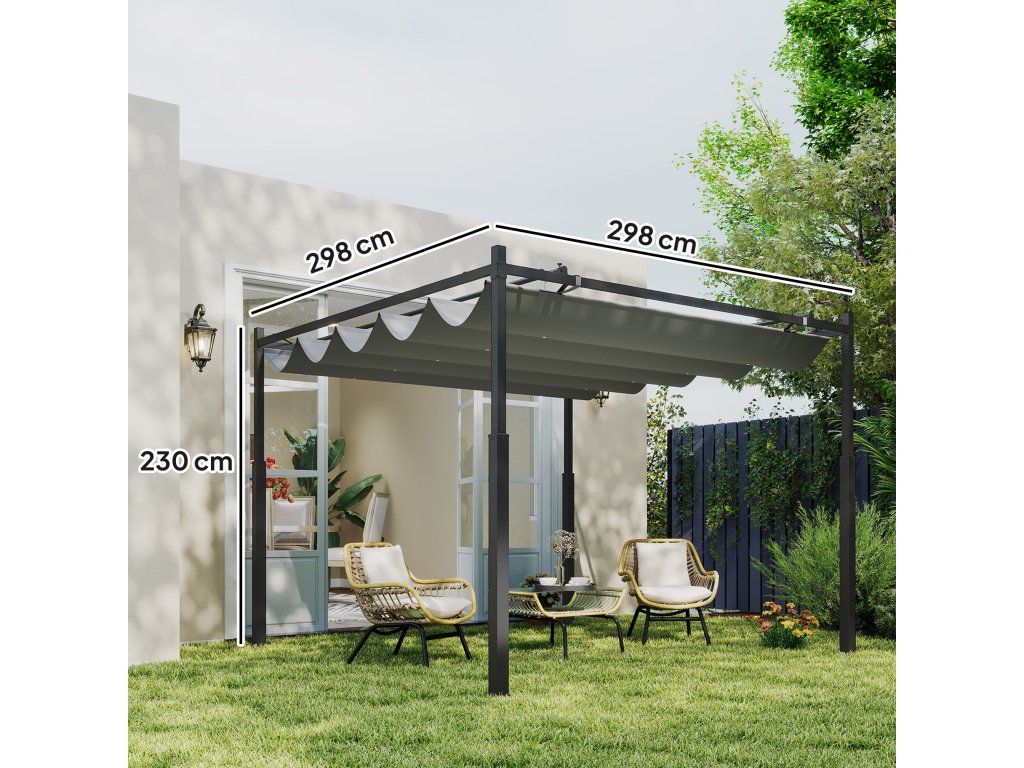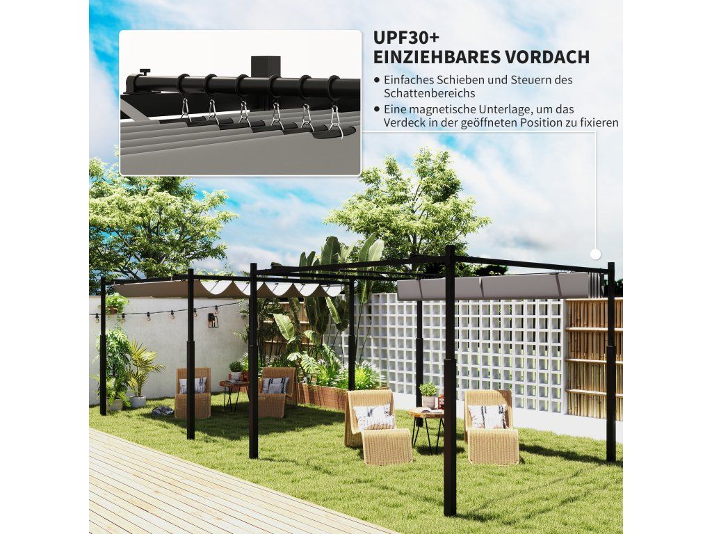Výsuvná stříška: Pergola je vybavena výsuvnou stříškou s 180g PA povlakem, ochranou UPF30+ a magnetickou podložkou na jedné straně pro stabilní umístění. Není vhodná pro použití v extrémních povětrnostních podmínkách.
