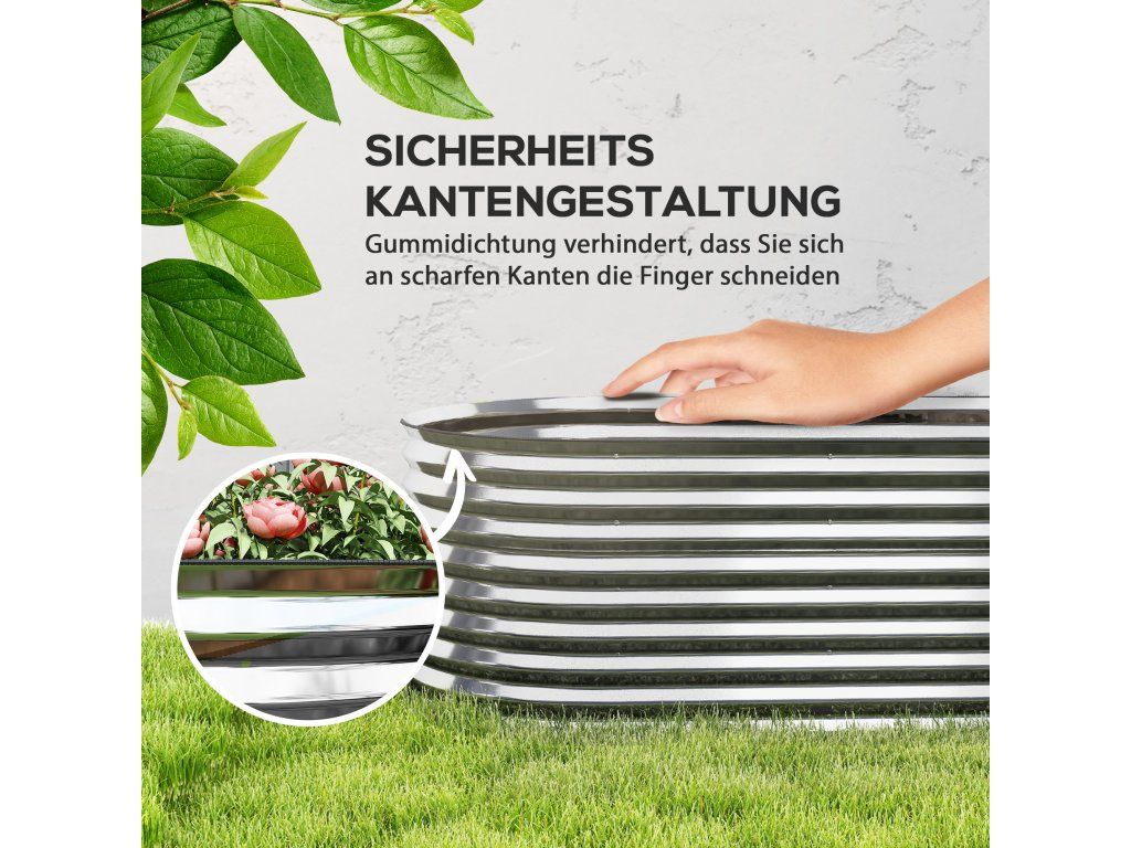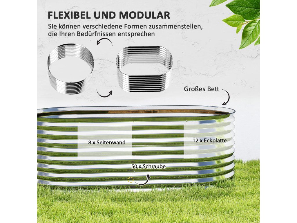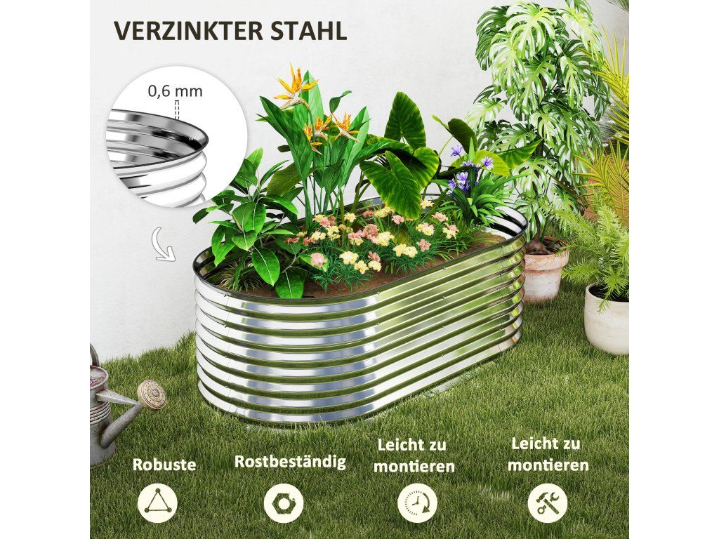 Modulární vyvýšený záhon se flexibilně přizpůsobí vašim designovým preferencím. Tento pozinkovaný vyvýšený záhon na balkony s vlnitou oválnou strukturou je odolný proti korozi a odolný vysokému tlaku i drsnému počasí. Je ideální pro hluboce zakořeněné rostliny a nabízí dostatek prostoru a hloubky. Otevřená základna květináče zajišťuje vynikající odvodnění a podporuje zdravé kořeny, zatímco gumové okraje a přiložené rukavice zvyšují bezpečnost montáže.