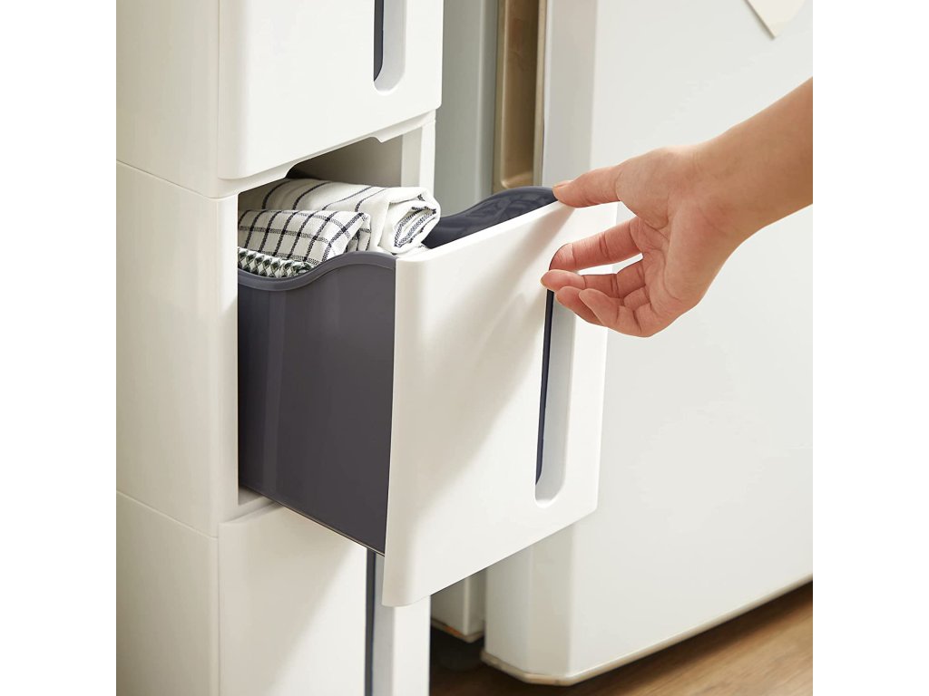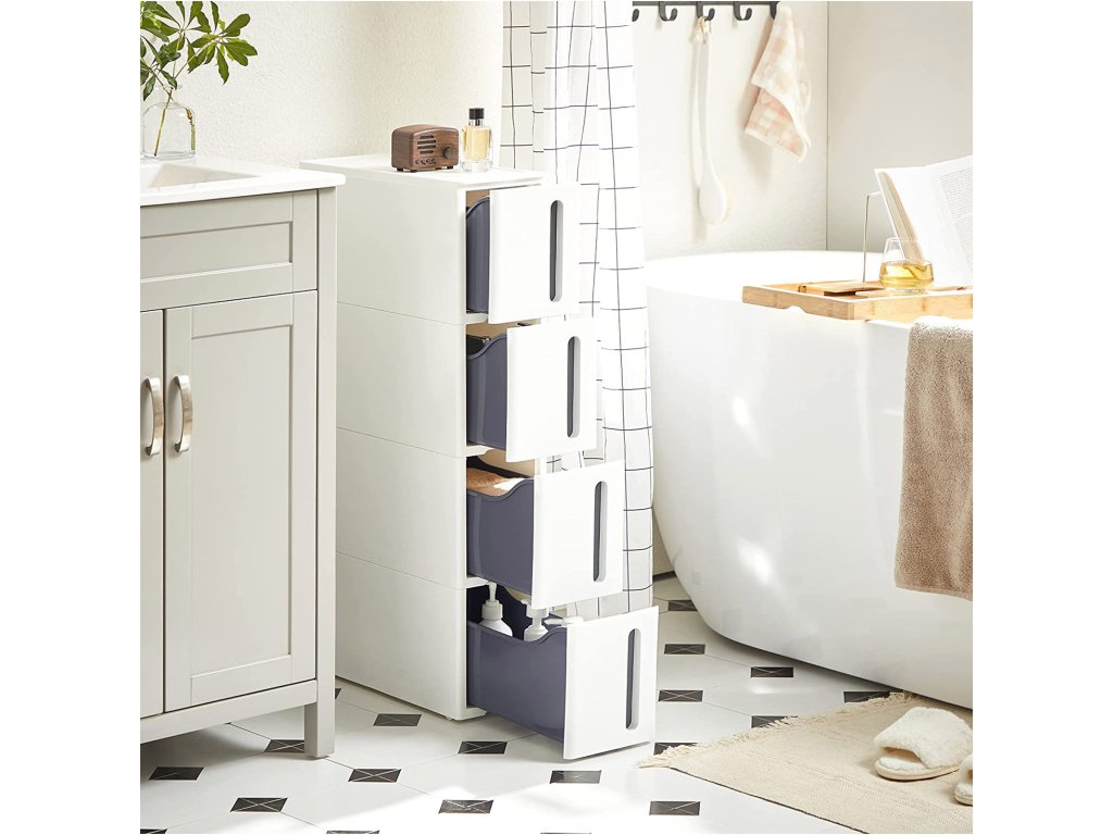 Plastové úložné zásuvky, úzký úložný vozík na kolečkách, úložná věž se 4 zásuvkami do koupelny a kuchyně, šetří místo, 45 x 17 x 83 cm, bílá a šedá.