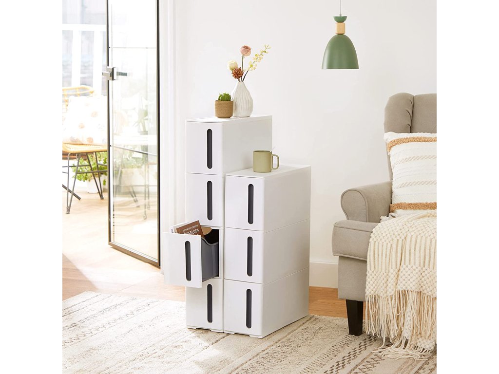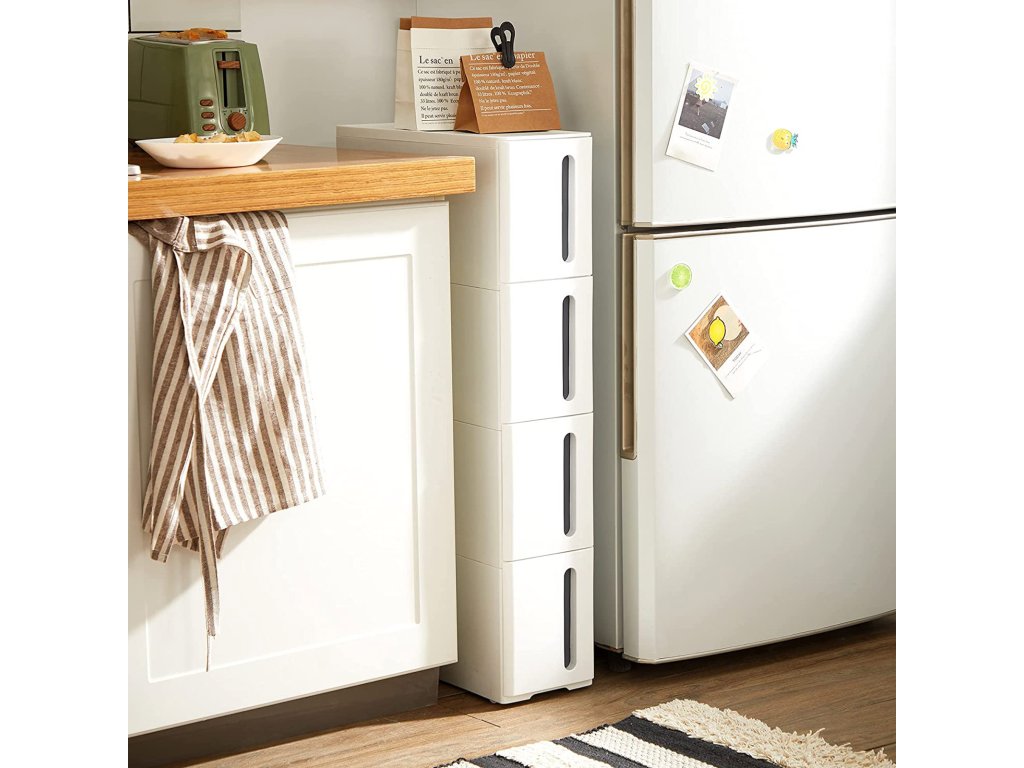 Využijte stísněné prostory: SONGMICS plastový úložný vozík z PP o rozměrech 45 x 17 x 83 cm se skvěle vejde mezi mezery a vytvoří úložný prostor, o kterém jste neměli tušení.4 výsuvné zásuvky: Na rozdíl od dřevěných nebo kovových polic vám tyto zásuvky z PP plastu pomohou rozloučit se s rzí, a to i v koupelně.Kolečka pro snadné převážení: Snadno tuto skladovací věž naloženou nápoji a občerstvením převezete do obývacího pokoje a podělíte se o ni s přáteli; snadno jej vysunete a snadno vyčistíte prostor pod ním;Nastavení za 2 minuty: Úložná jednotka se dodává ve dvou částech. Stačí je zacvaknout k sobě, připevnit 4 kolečka a tento pojízdný vozík je připraven vyrazit kamkoli budete potřebovat.Co získáte: Úzký úložný vozík se 4 prostornými zásuvkami, 4 kolečky pro snadné přemisťování a jednoduchý způsob, jak rozšířit úložný prostor v obývacím pokoji, koupelně a kuchyni.| Kategorie: | Regály a poličky |