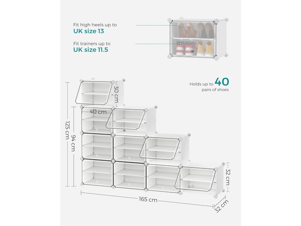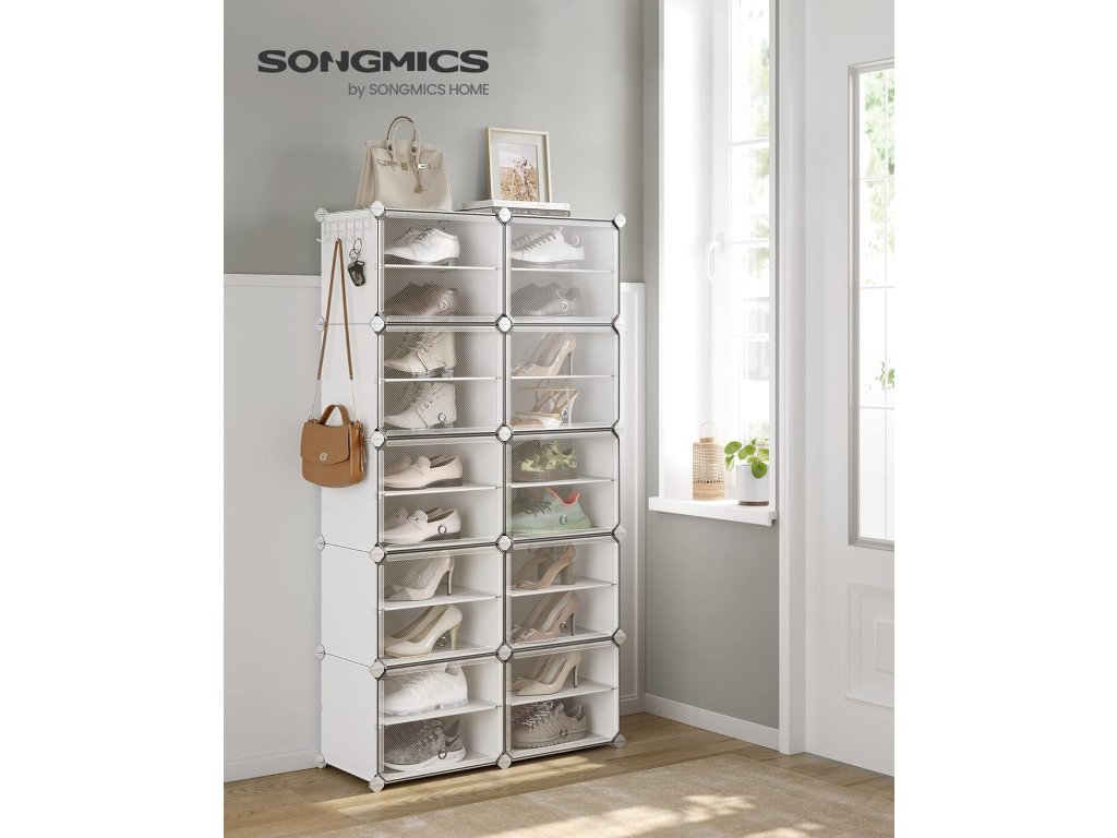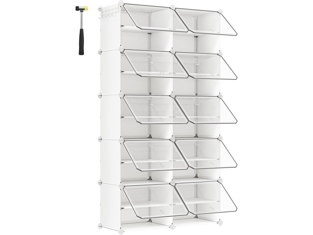 Plastový botník, 10 slotů, modulární úložná jednotka, 30 x 40 x 30 cm pro každý slot, s dveřmi, ocelový rám, plastové panely, bílý.