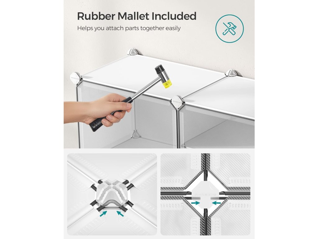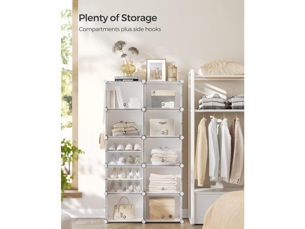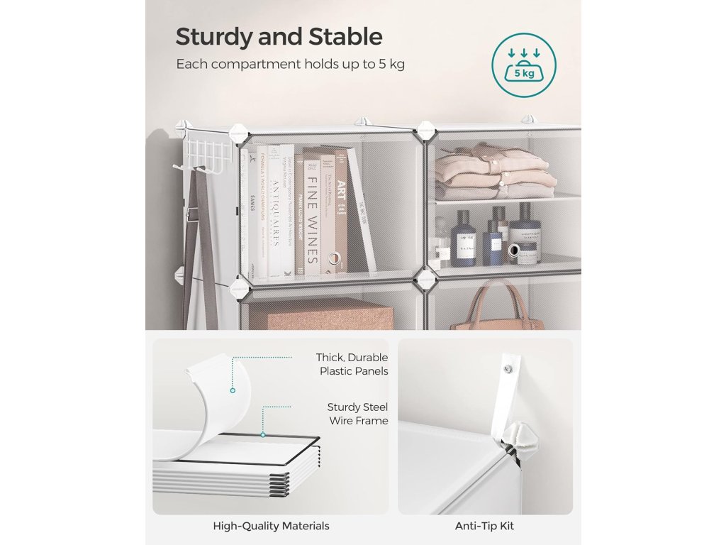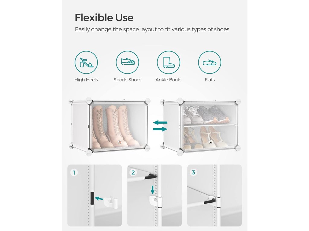 Dostatek místa Tento plastový organizér na boty, který pojme až 40 párů bot, lze použít i na uložení tašek a oblečení. Díky bočním háčkům, které šetří místo, je to pohodlný způsob, jak zavěsit klobouky nebo vodítka pro psy.Robustní a bezpečný Každá přihrádka této skříně na boty je vyrobena z vysoce kvalitních konektorů, plastových panelů a robustního ocelového drátu a unese až 5 kg. Přiložená sada proti překlopení zvyšuje bezpečnost při použití v obývacích pokojích nebo ložnicích.Snadná montáž a demontáž Díky přiložené gumové paličce je montáž tohoto stojanu na boty rychlá a snadná. Tento organizér lze také rychle rozložit pro uskladnění nebo přepravu, takže jej můžete snadno přemístit po celém domě.Přizpůsobivost a univerzálnost Tuto úložnou jednotku můžete konfigurovat různými způsoby. Vytvořte 2 nebo 3 samostatné řady, nebo je dokonce rozdělte na 2 malé poličky, abyste mohli uspořádat boty, oblečení nebo toaletní potřeby v předsíni, koupelně nebo jiném požadovaném prostoru.Větrání a snadné čištění Tato plastová skříňka na boty má průhledná dvířka, která poskytují prachotěsnou a vodotěsnou ochranu a zároveň umožňují snadný přehled o botách uvnitř. Průchodky na dveřích umožňují snadné otevírání a podporují větrání.| Kategorie: | Úložné boxy |