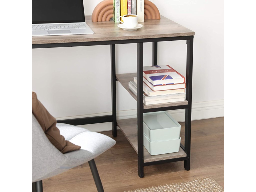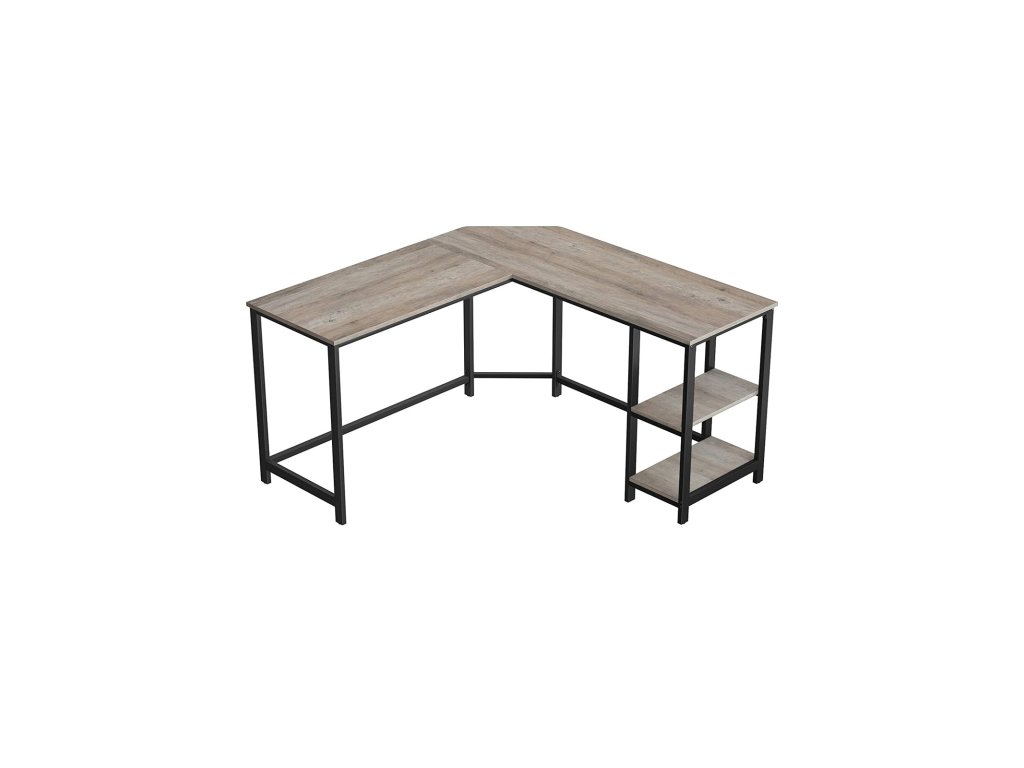 Počítačový stůl, rohový stůl ve tvaru L, pracovní stanice s policemi pro domácí kancelář, prostorově úsporný, snadno sestavitelný, průmyslový, béžovo-černý.