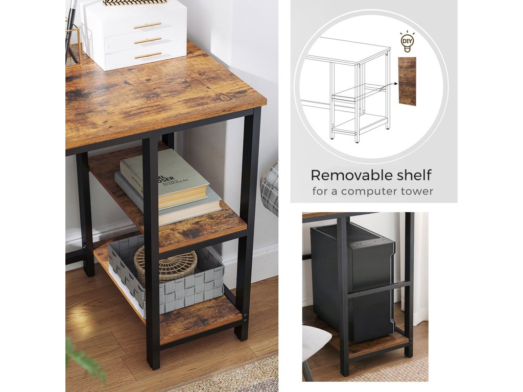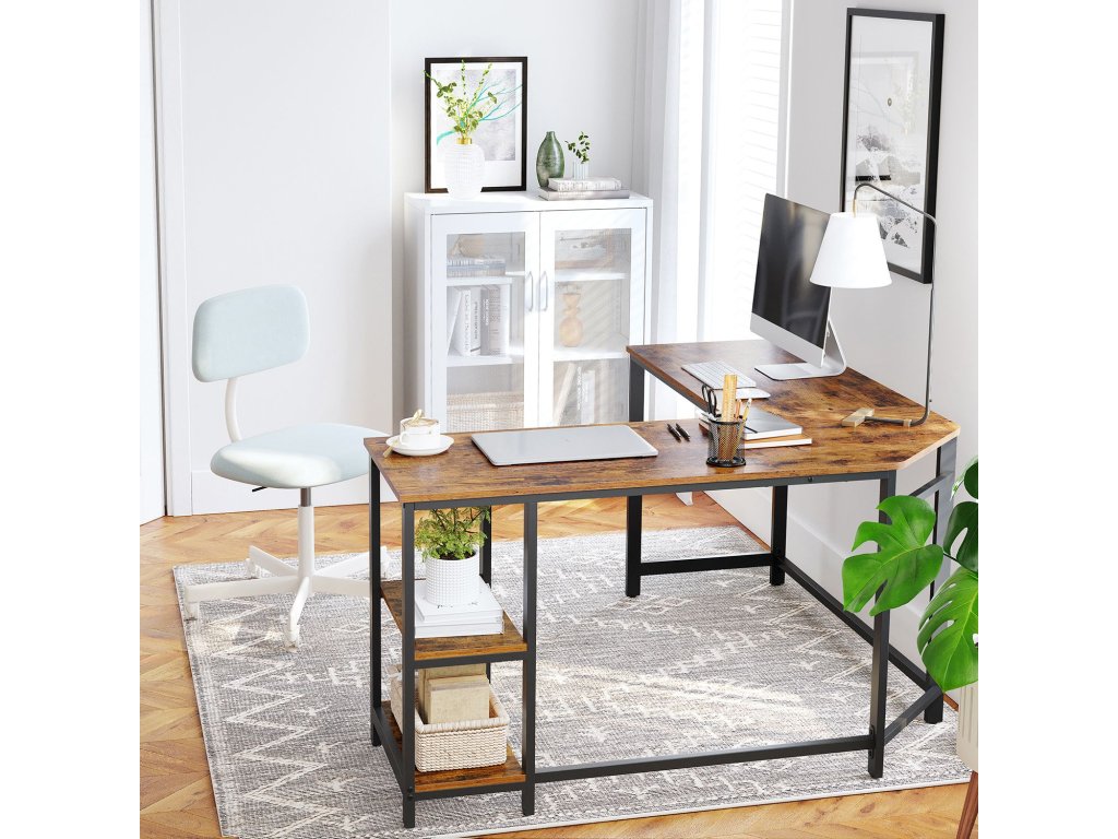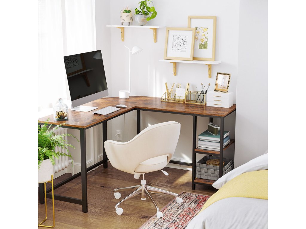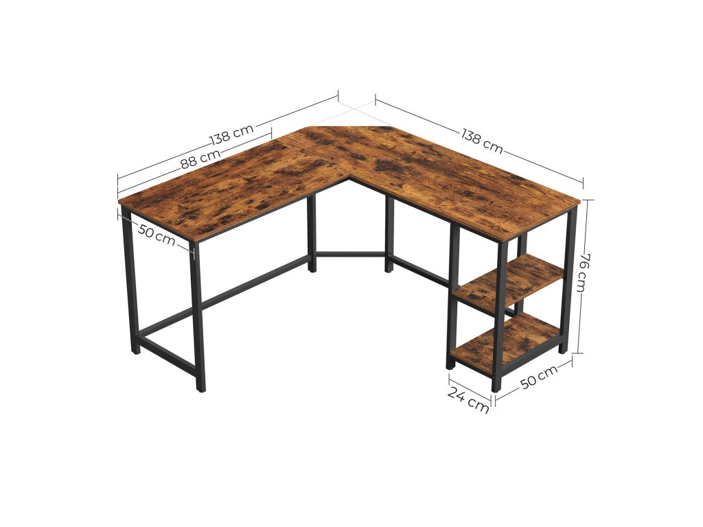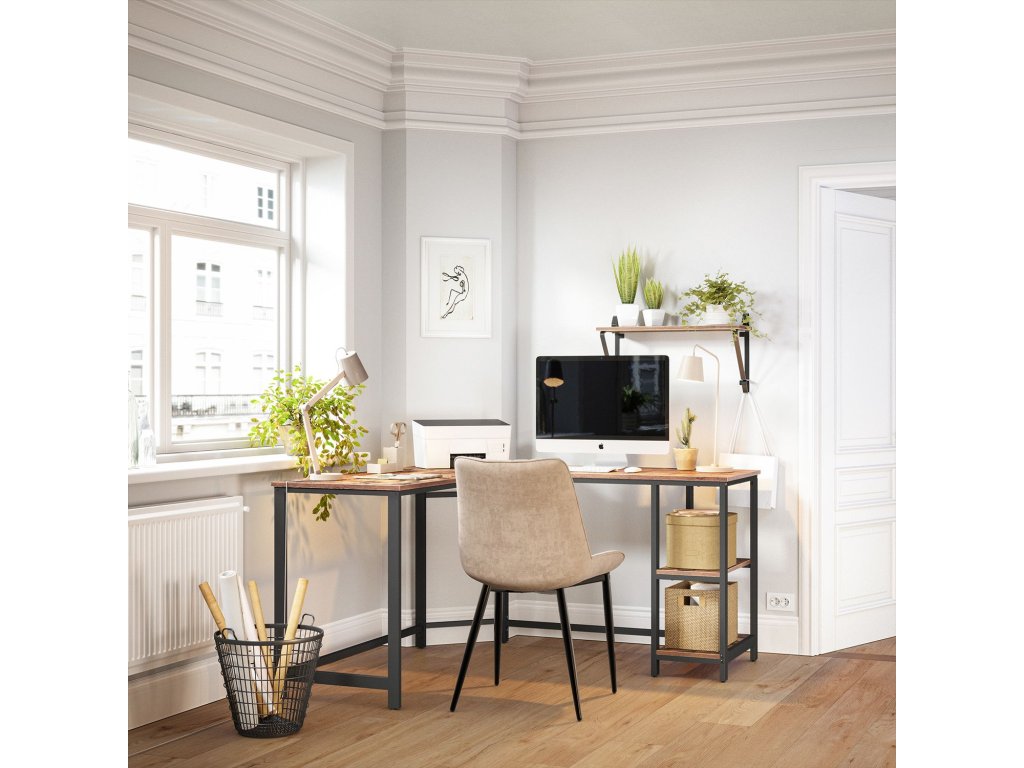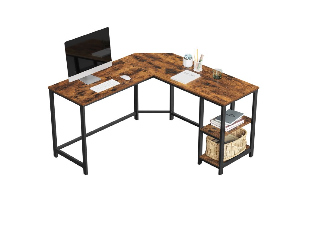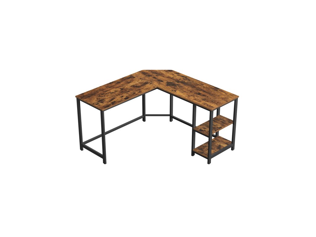 Počítačový stůl, rohový stůl ve tvaru L, pracovní stanice s policemi pro domácí kancelář, prostorově úsporný, snadno sestavitelný, průmyslový, rustikální hnědo-černý.
